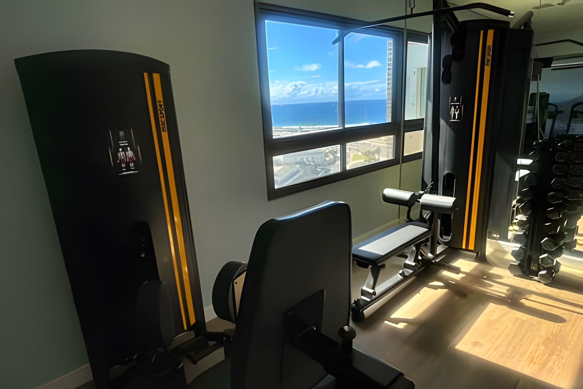 Condomínio dispõe: Portaria 24h, elevadores, cameras de segurança, academia climatizada com vista ao mar, lavanderia (paga), coworking, salão de festa, garagem coberta(rotativa mediante disponibilidade), interfone, piscina na cobertura com vista panorâmica para o mar. Hóspede com total acesso.