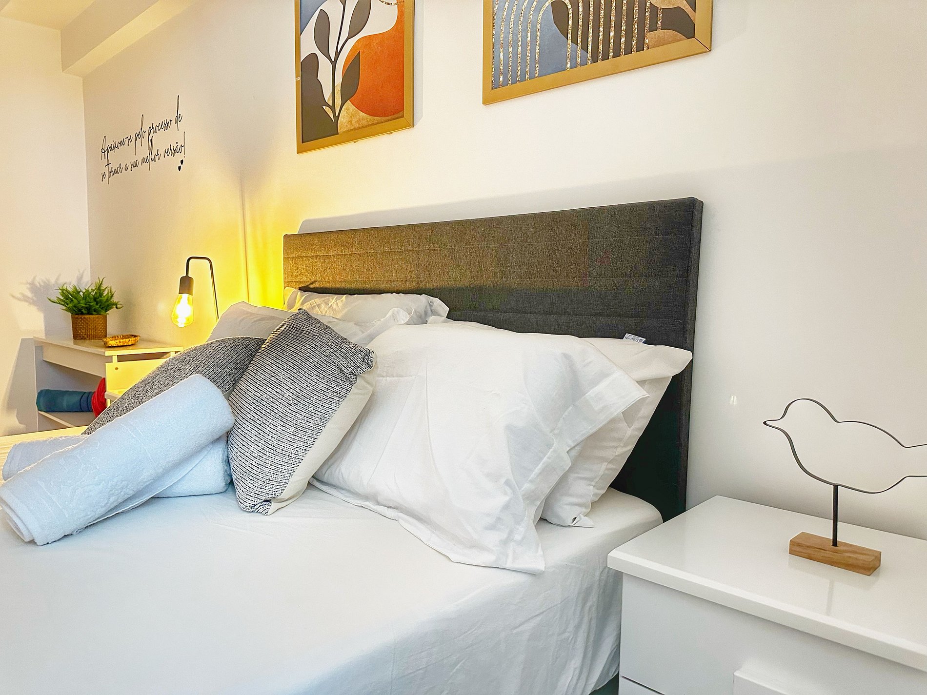 *Suíte Quarto - cama de casal (com ar condicionado). Fornecemos roupas de cama e banho e deixamos disponível para uso ferro de passar.