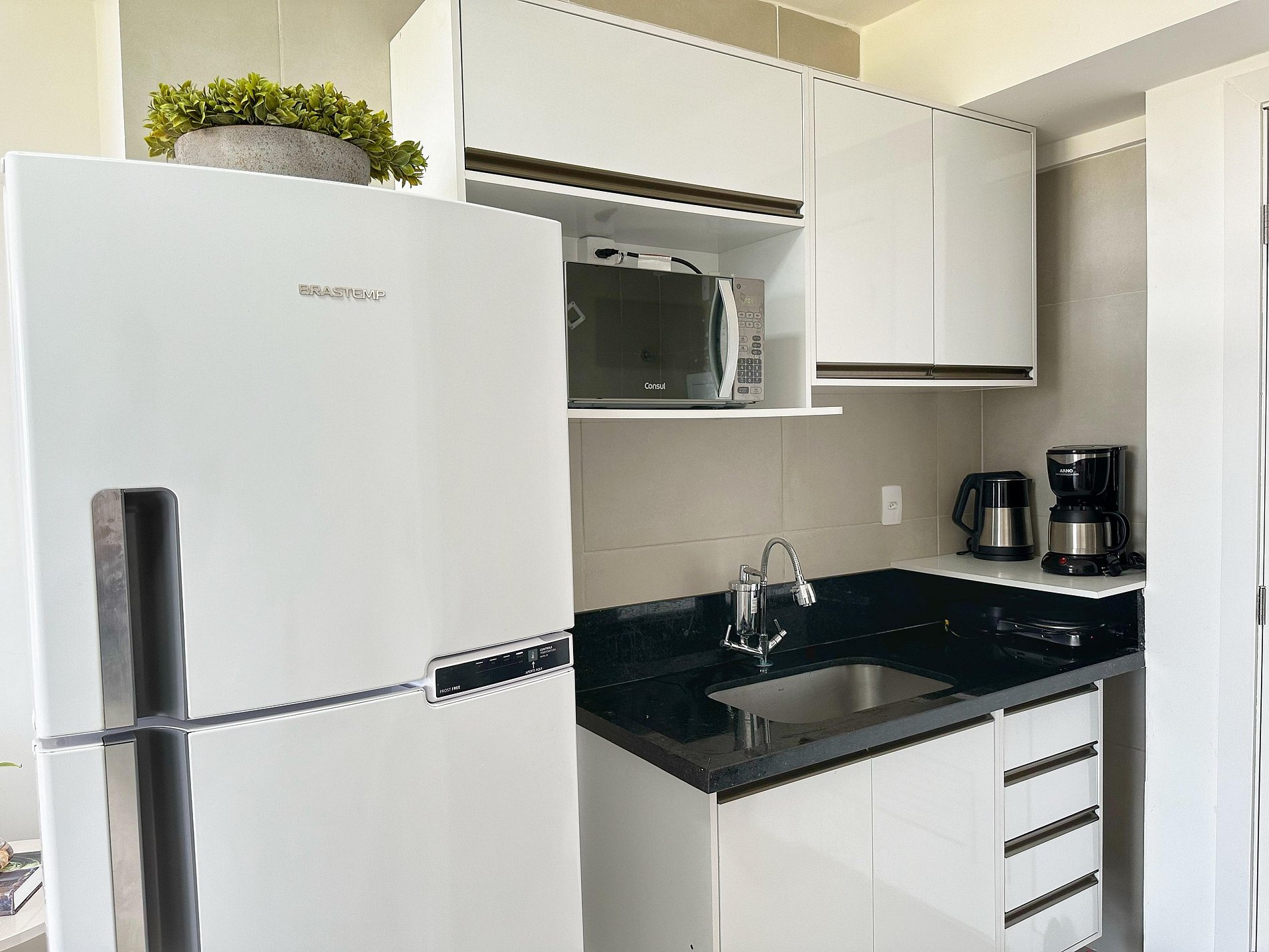 *Cozinha- equipada com itens básicos (garrafa térmica, xicaras, panelas, copos, talheres, tacas, pratos e talheres), bem como fogao, microondas, geladeira e cafeteira.