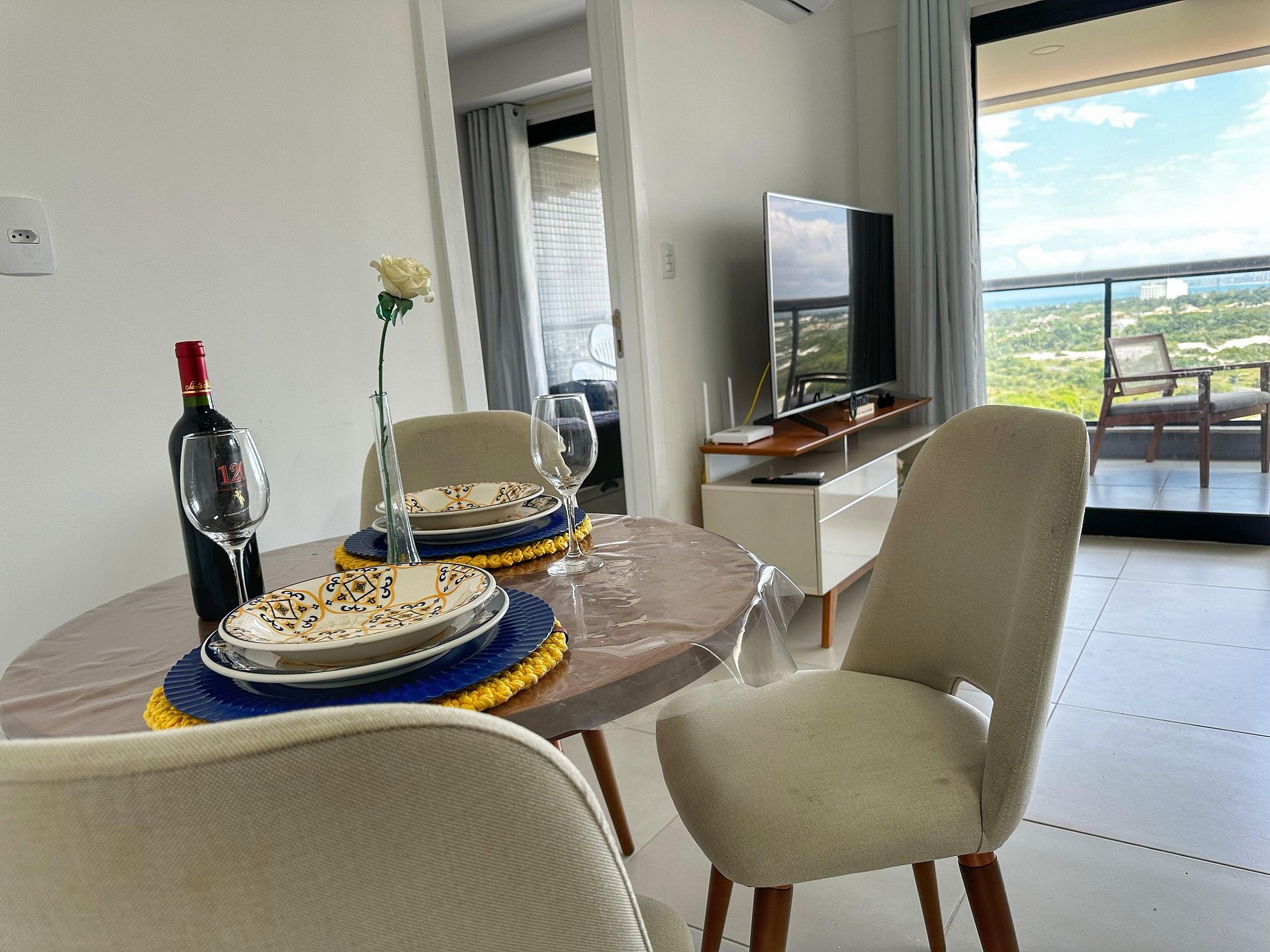 O apartamento conta com uma suíte com ar condicionado, sala, cozinha e varanda. Apto possui ar cond na sala e conta uma Tv smart e cozinha com fogão a gás duas bocas, geladeira, microondas, utensílios de cozinha e uma pequena área de serviço com maquina de lavar , tanque e varal de teto.