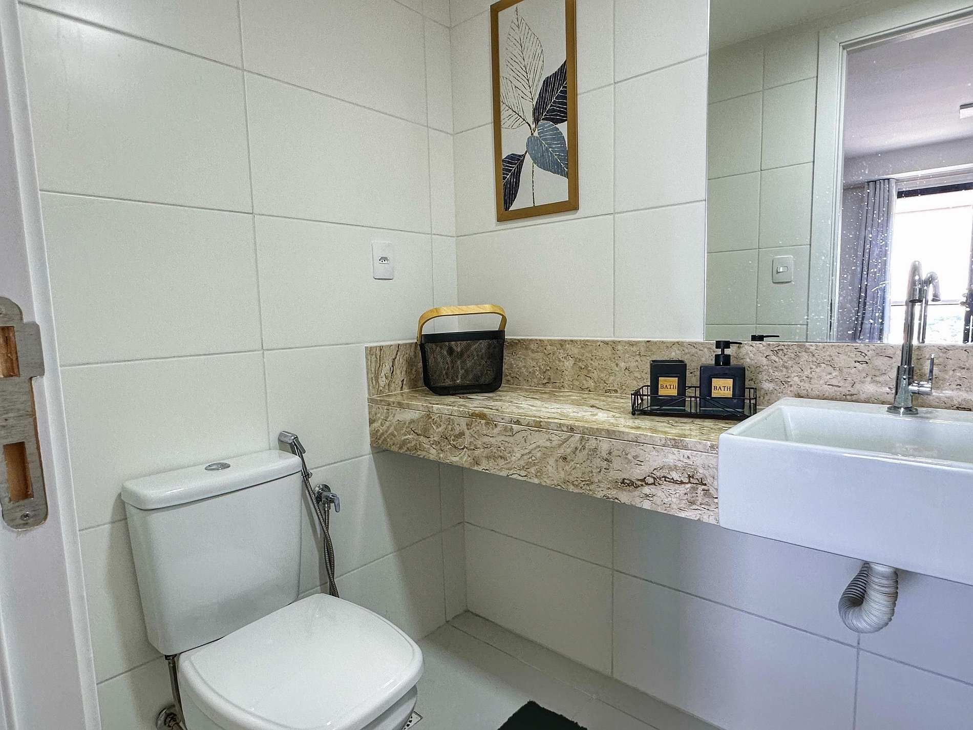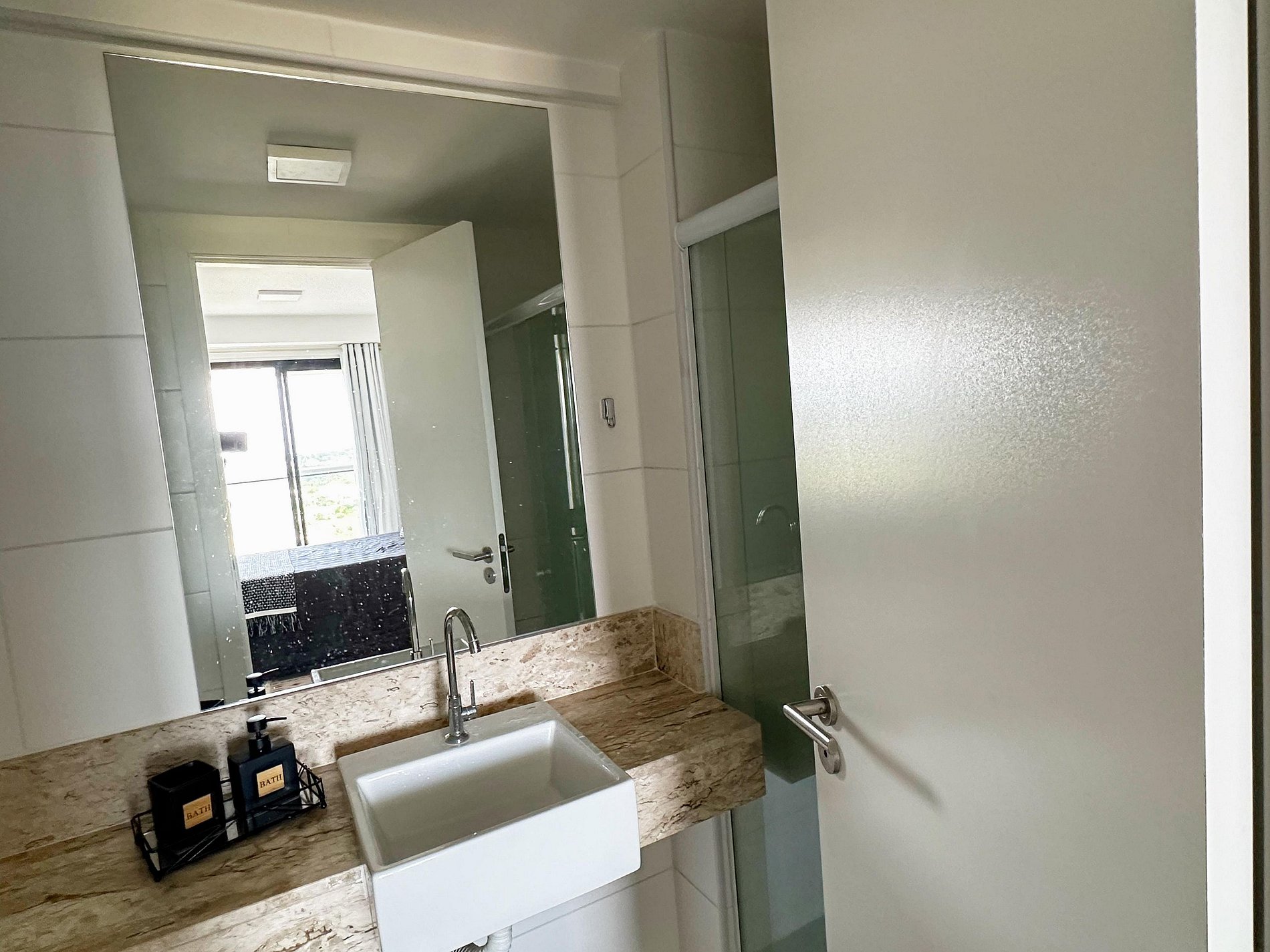 *Banheiro - Box de vidro, chuveiro quente, espelho grande e secador de cabelo.