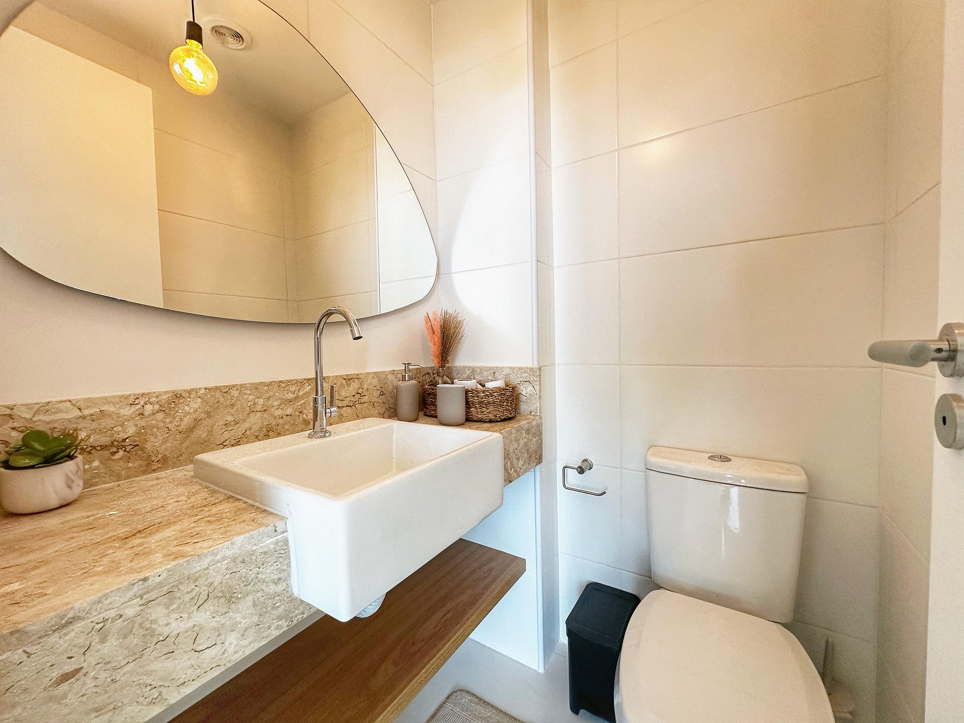 O apartamento conta com uma suíte com ar condicionado, sala, lavabo cozinha, área de serviço e uma super varanda. Apto possui ar condicionado na sala e quarto. Conta com uma Tv smart na espaçosa sala integrada a cozinha com fogão quatro bocas, geladeira, micro-ondas, cafeteira, utensílios de cozinha e uma pequena área de serviço com maquina de lavar, tanque e varal de chão.