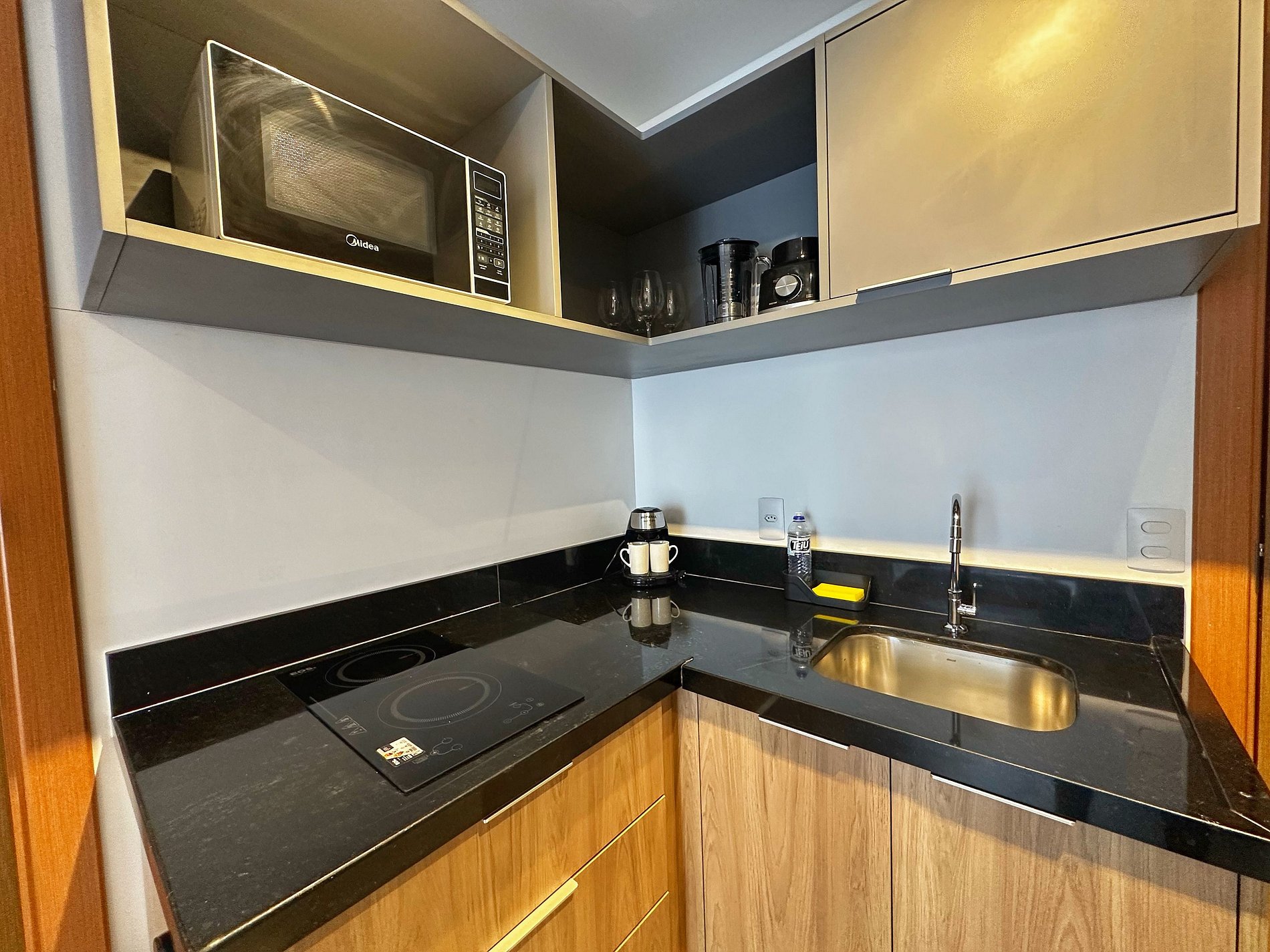 O espaço conta com uma cozinha integrada e compacta com todos os principais utensílios, cafeteira, cooktop de indução, microondas, geladeira e bancada de granito