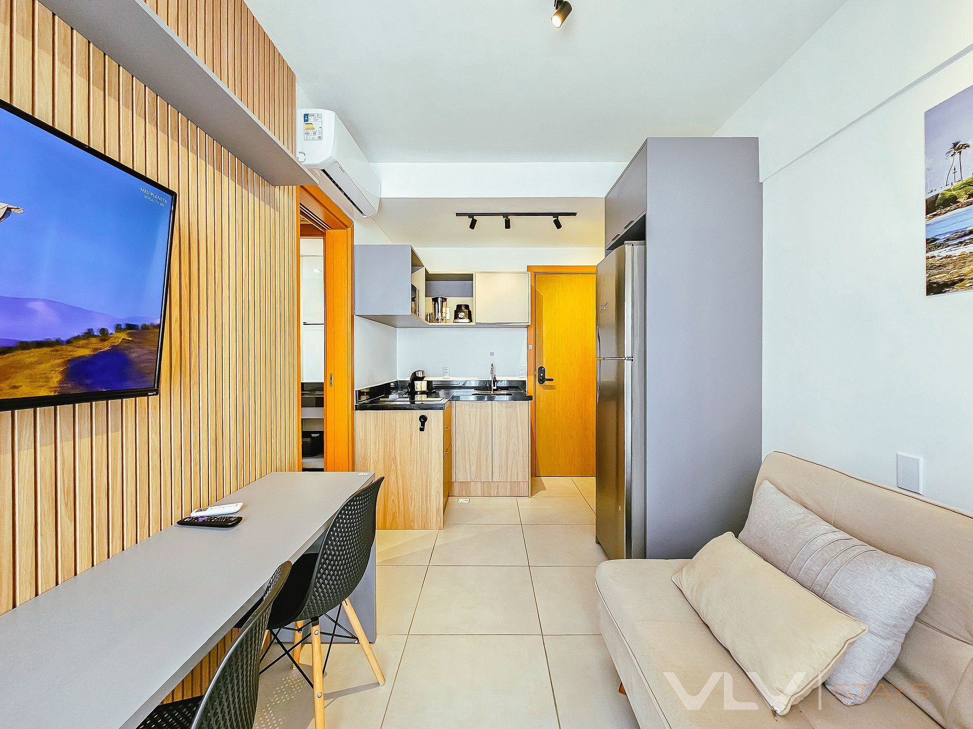 Sala dispoe de um sofa-cama, além de uma Smart TV, ar condicionado, bancada de trabalho/refeição, cadeiras e acesso a varanda.