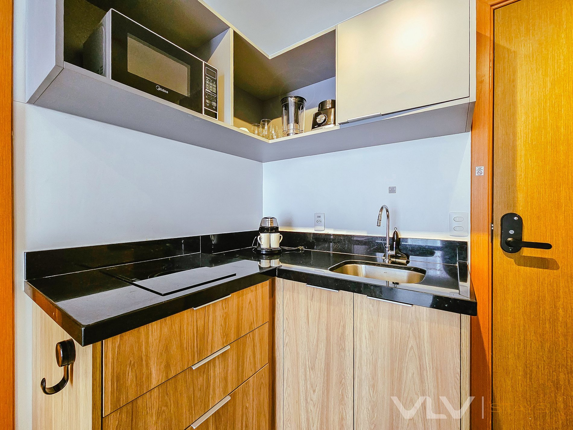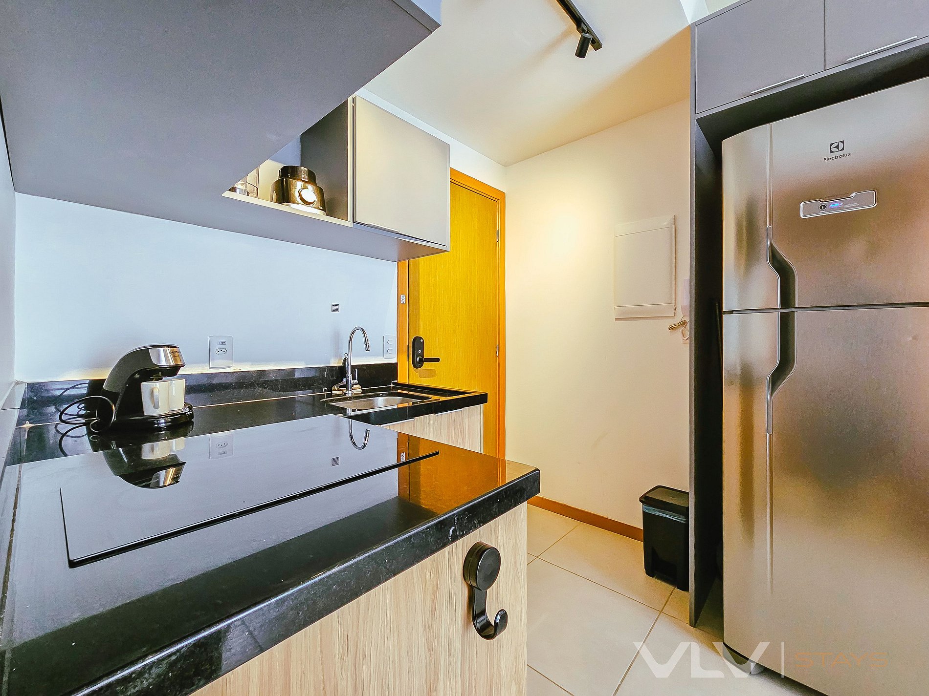 O espaço conta com uma cozinha integrada e compacta com todos os principais utensílios, cafeteira, cooktop de indução, microondas, geladeira e bancada de granito