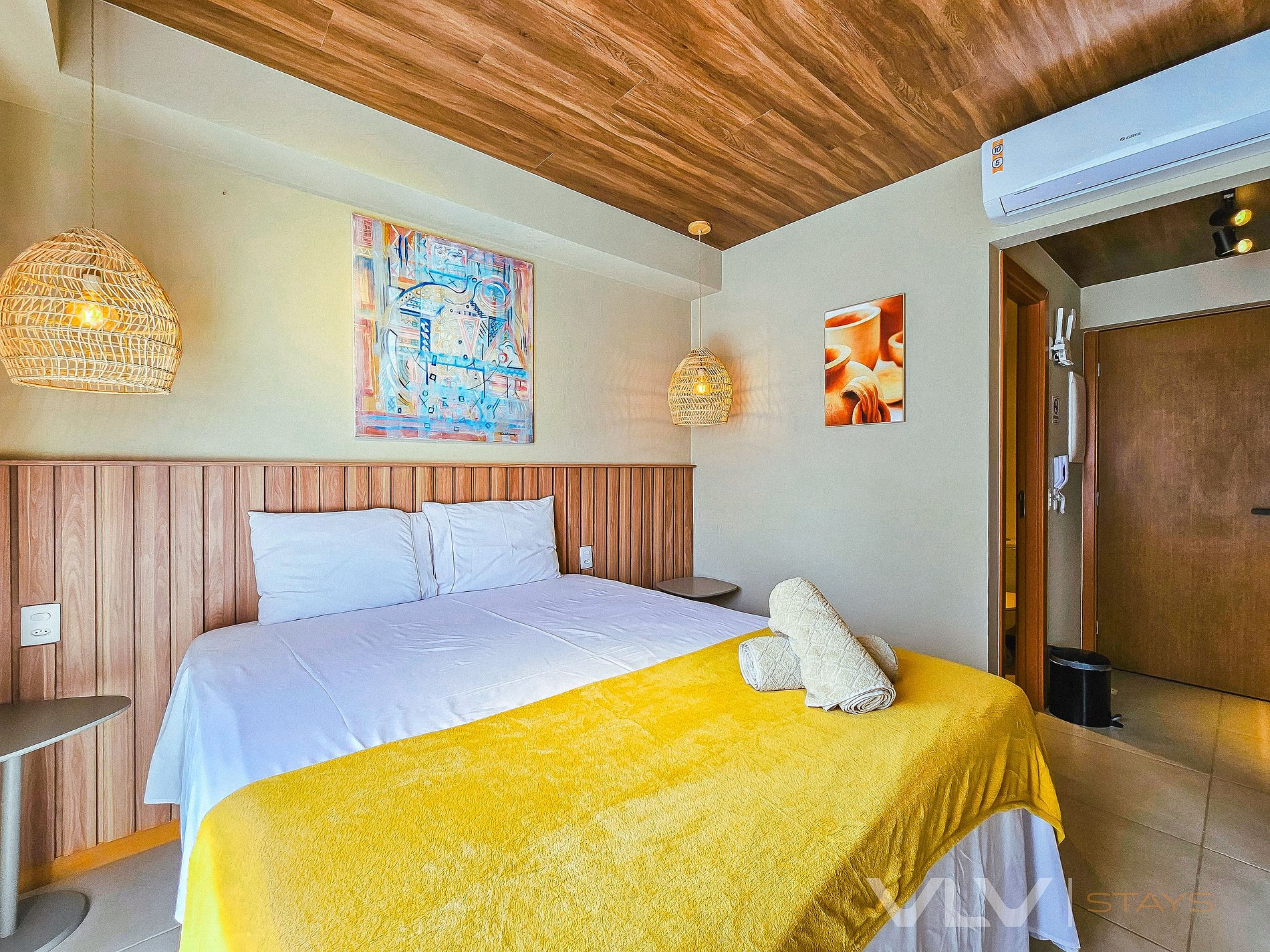 The climate-controlled environment features air conditioning, ensuring a pleasant temperature for your relaxation. The comfortable bed is designed to offer a peaceful night's sleep, and the spacious layout provides freedom to unwind and enjoy your stay to the fullest.