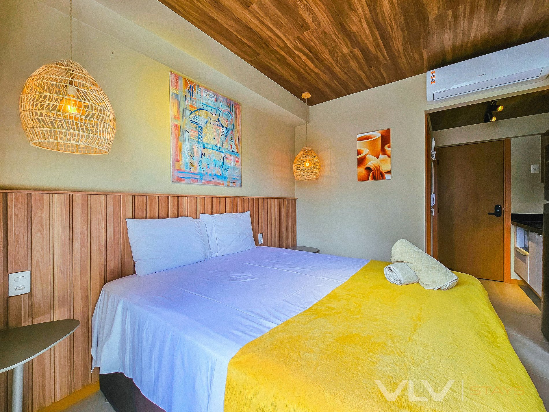The climate-controlled environment features air conditioning, ensuring a pleasant temperature for your relaxation. The comfortable bed is designed to offer a peaceful night's sleep, and the spacious layout provides freedom to unwind and enjoy your stay to the fullest.