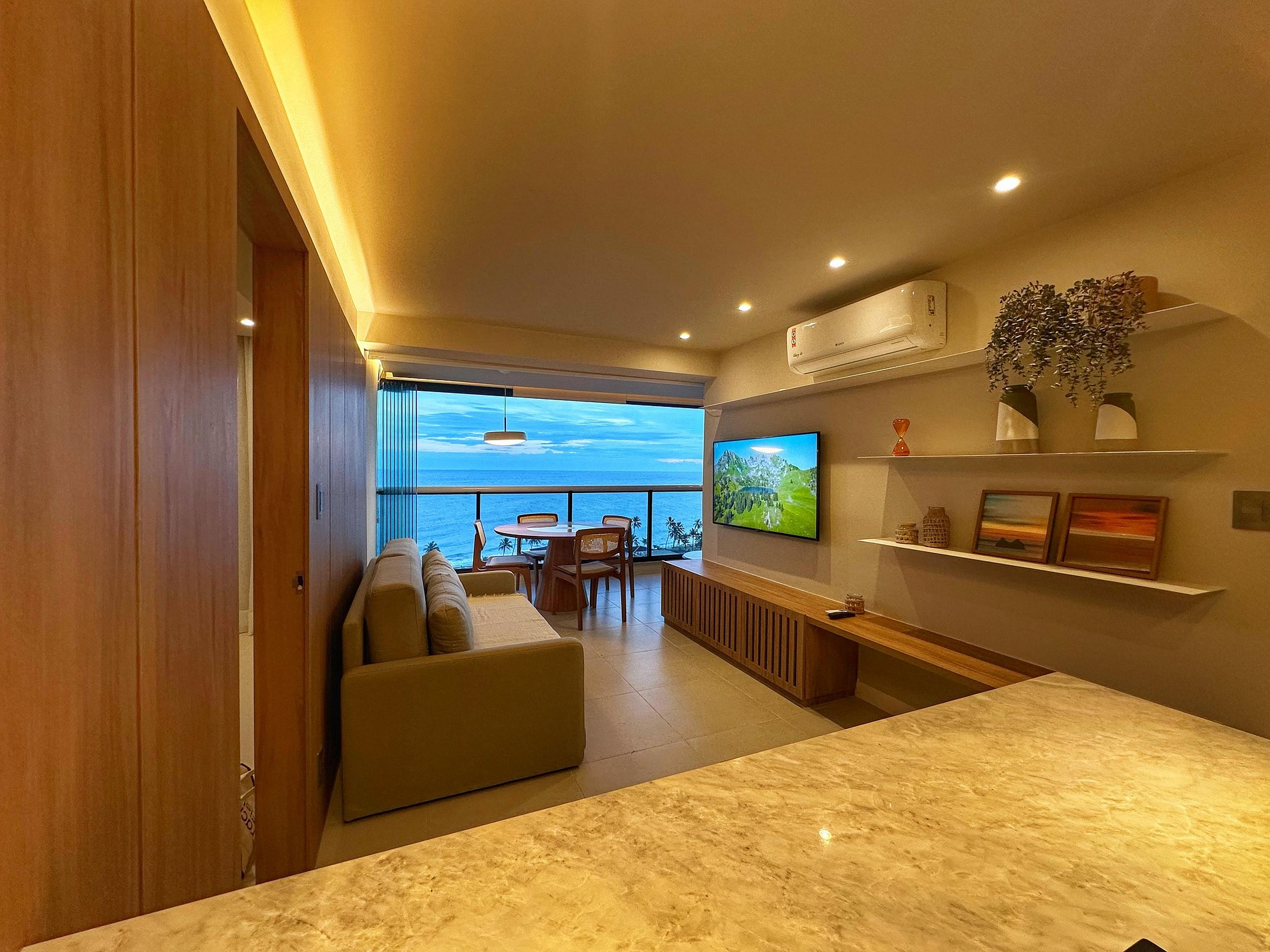 Deslumbrante apartamento finamente decorado com 2 quartos, sendo uma suíte, ar condicionado split em todos ambientes controlados individualmente, vista mar frontal. Acomoda confortavelmente 6 pessoas (2 camas de casal + 1 sofá-cama). Desfrute das comodidades do prédio, como a incrível piscina VISTA MAR no rooftop, academia completa climatizada com sala de spinning, 2 salas de coworking e brinquedoteca. Deixe-se envolver pela magia da Bahia e comece a criar memórias inesquecíveis!