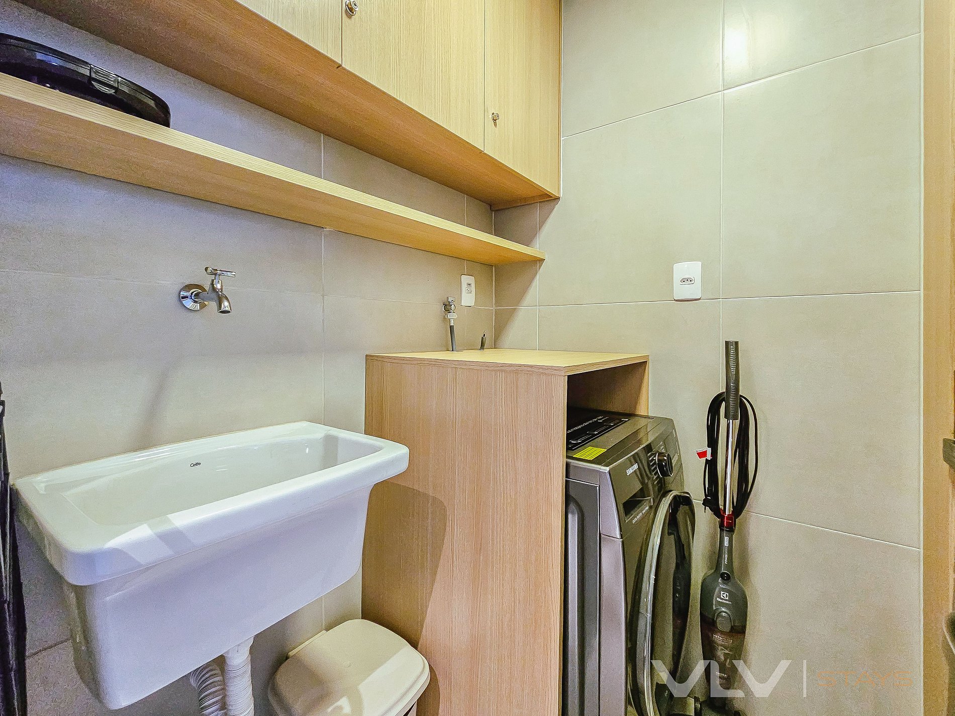 Laundry Area – Sink, washer/dryer, and vacuum cleaner.