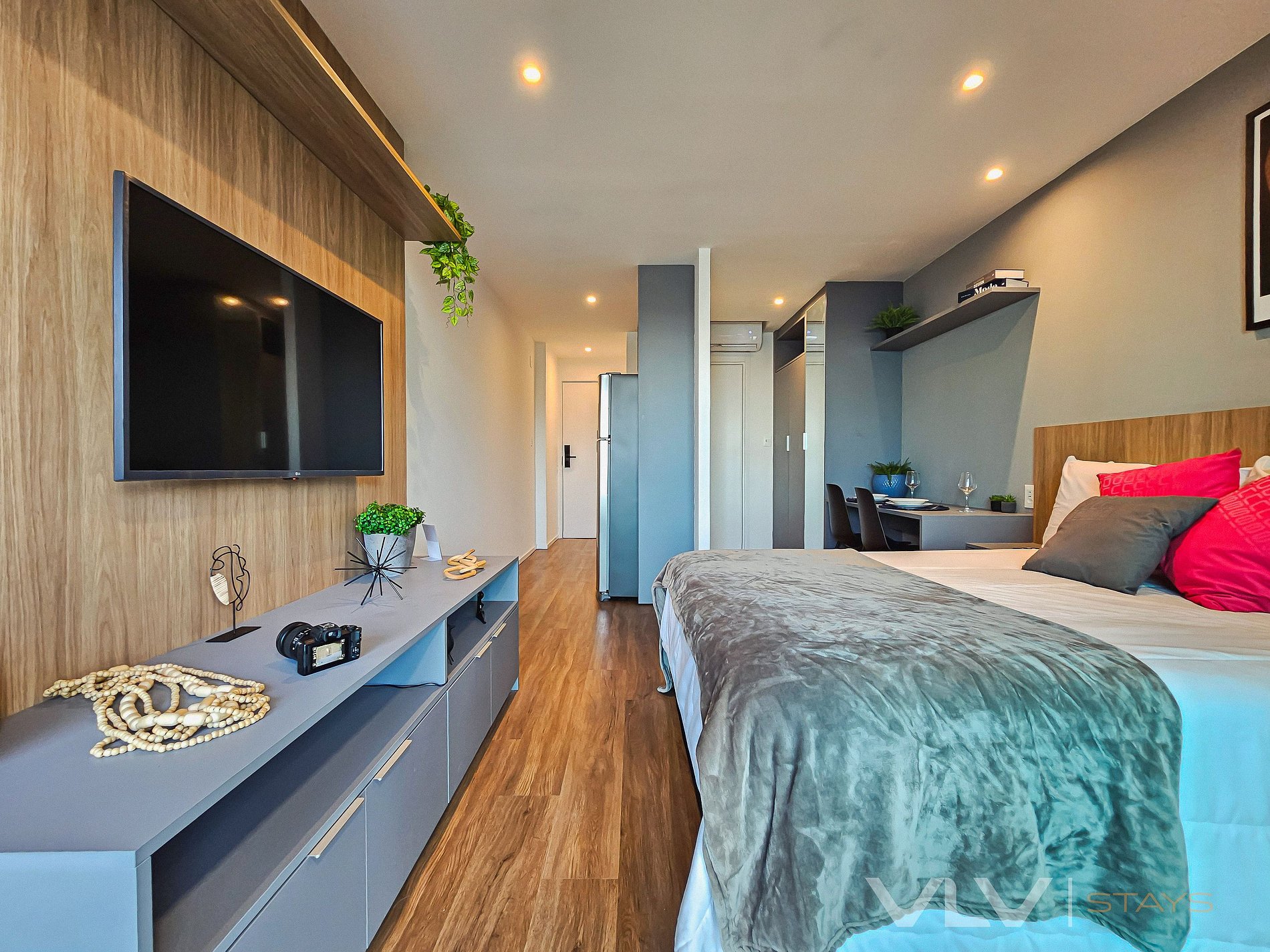 Total Comfort: Modern, fully equipped studios with a complete kitchen, air conditioning, and high-speed Wi-Fi, giving you the freedom to feel at home.