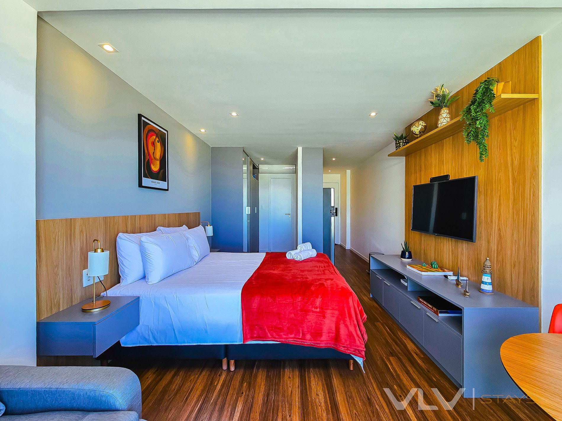Enjoy a modern, cozy, and beautifully decorated studio located right in front of Armação Beach. The space features a double bed, sofa-bed, a fully equipped kitchen, fast Wi-Fi, and everything you need to feel at home.