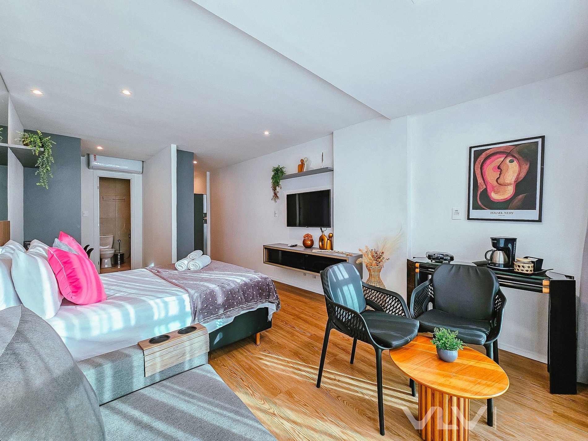 Enjoy a modern, cozy, and beautifully decorated studio located right in front of Armação Beach. The space features a double bed, a fully equipped kitchen, fast Wi-Fi, and everything you need to feel at home.