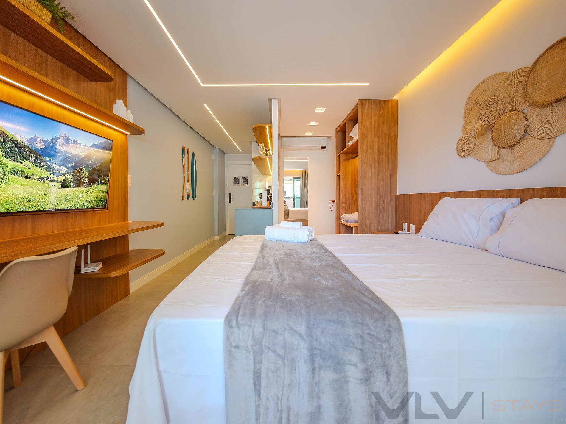 Enjoy a modern, cozy, and beautifully decorated studio located right in front of Armação Beach. The space features a double bed, sofa-bed, a fully equipped kitchen, fast Wi-Fi, and everything you need to feel at home.