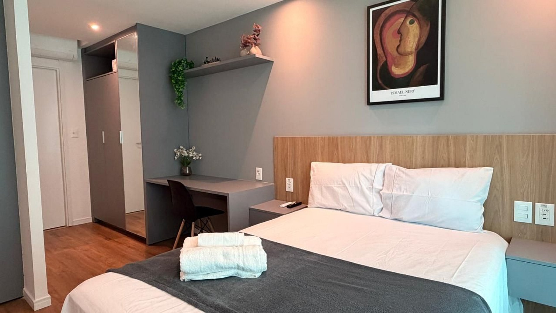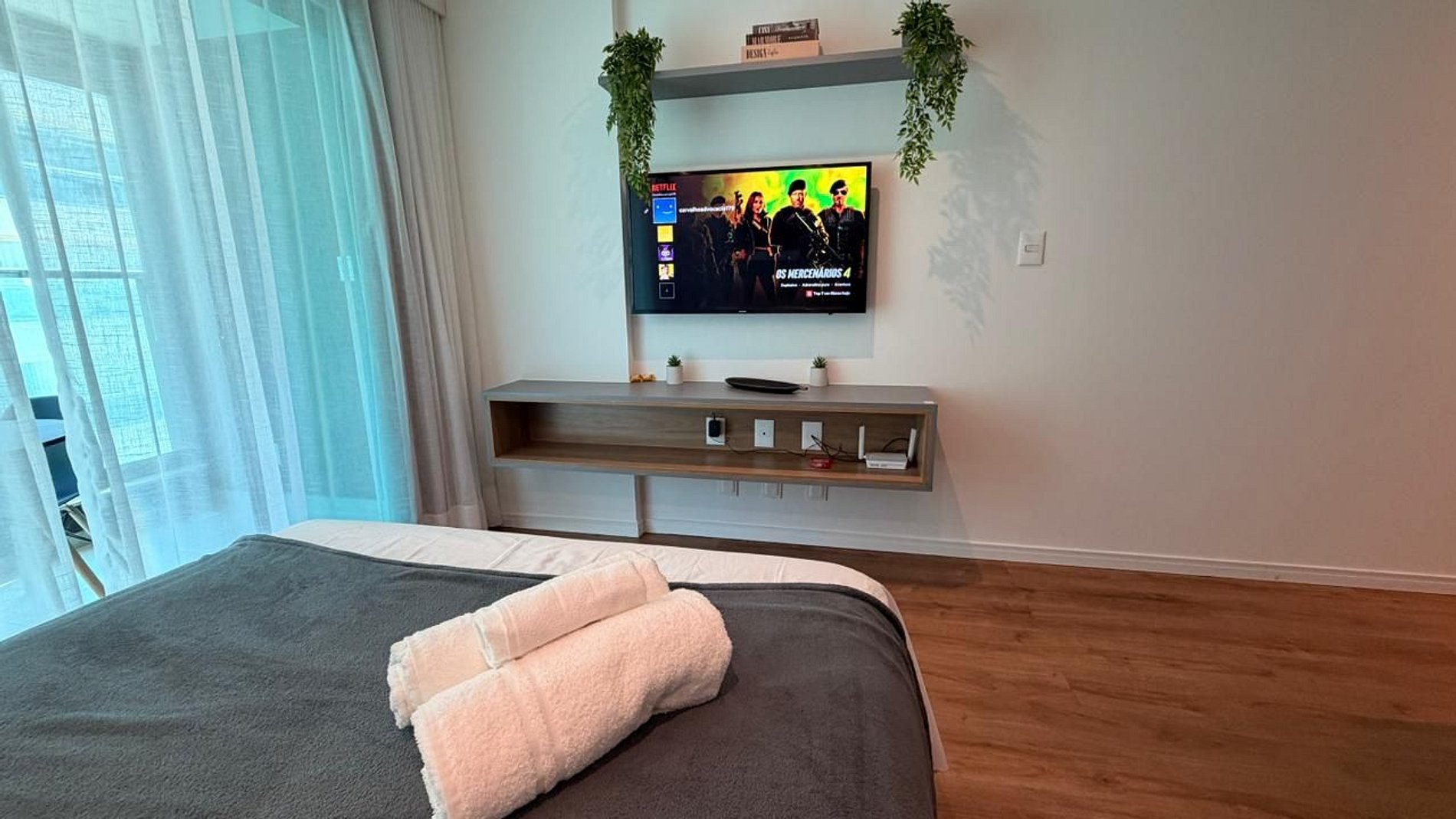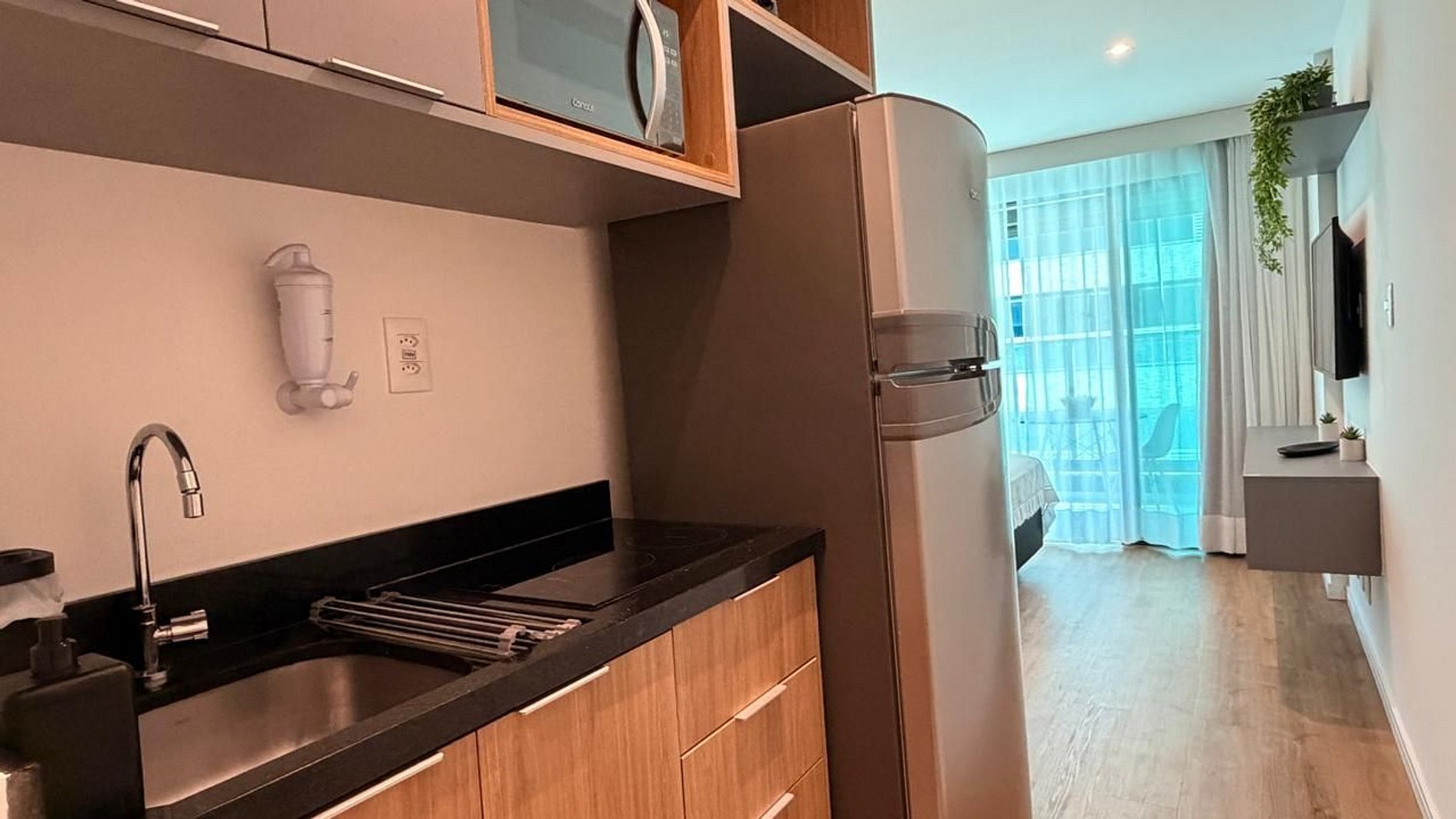 Enjoy a modern, cozy, and beautifully decorated studio located right in front of Armação Beach. The space features a double bed, a fully equipped kitchen, fast Wi-Fi, and everything you need to feel at home.