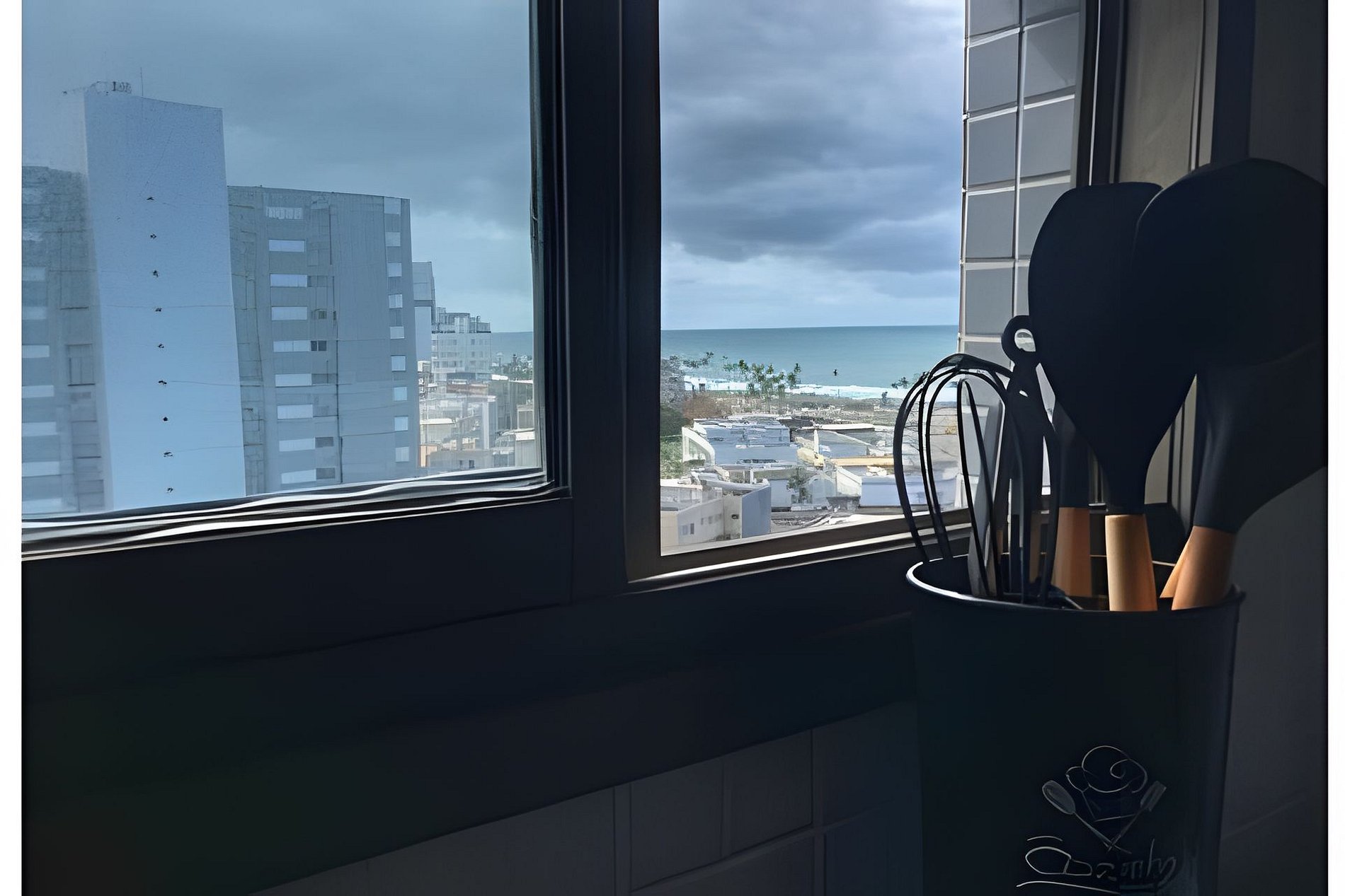 A janela do apartamento tem vista livre para o horizonte/cidade já que estamos no 11° andar onde fica a piscina que tem vista deslumbrante para o mar, academia, lavanderia, coworking.