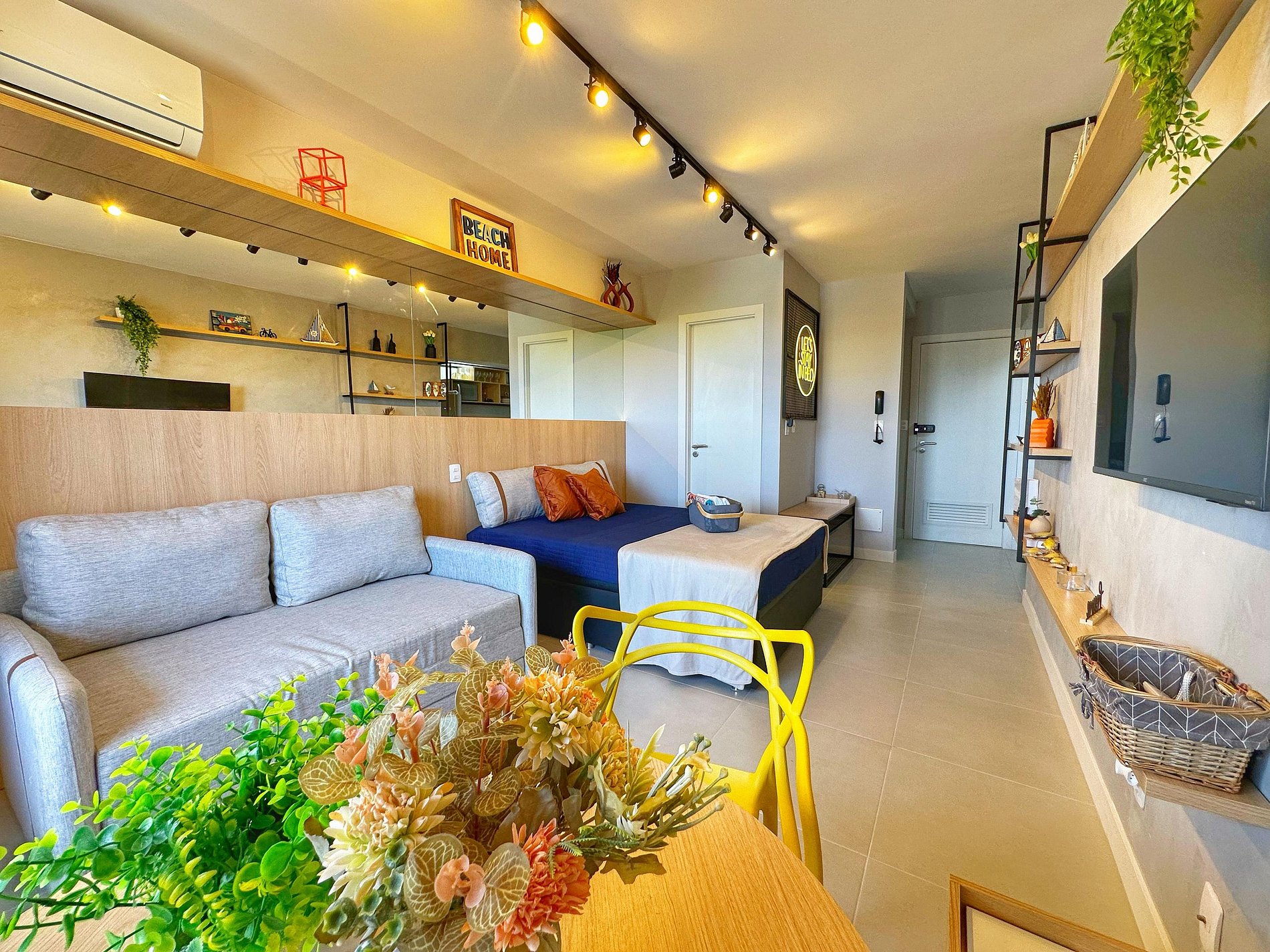 A sala e cozinha integradas, também climatizadas, possuem uma Tv smart, fogão, geladeira, microondas, utensílios de cozinha e uma pequena área de serviço. Cada detalhe aqui foi pensando para lhe dar o máximo de conforto.