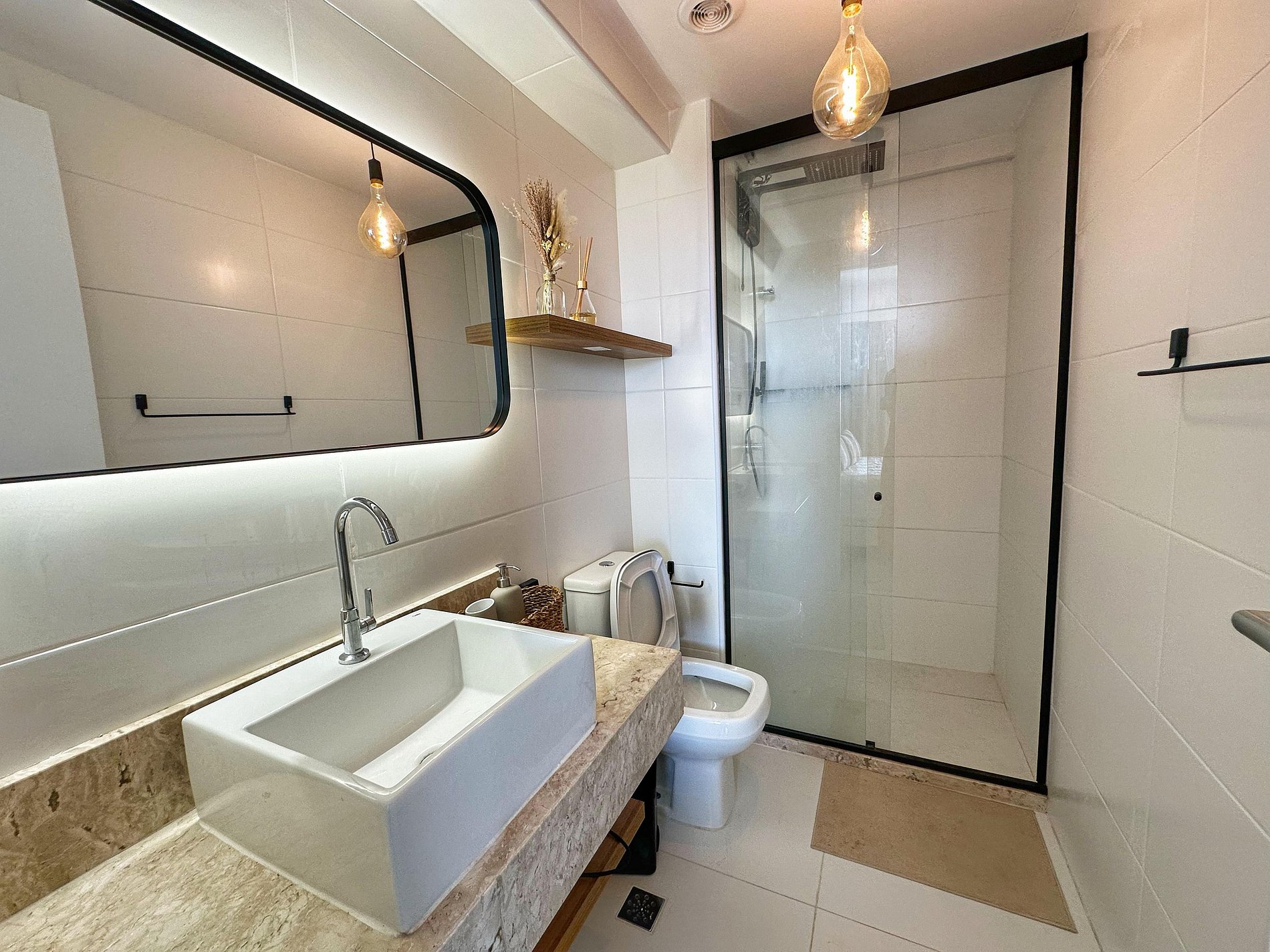 *Lavabo com pia, vaso e espelho luminoso .