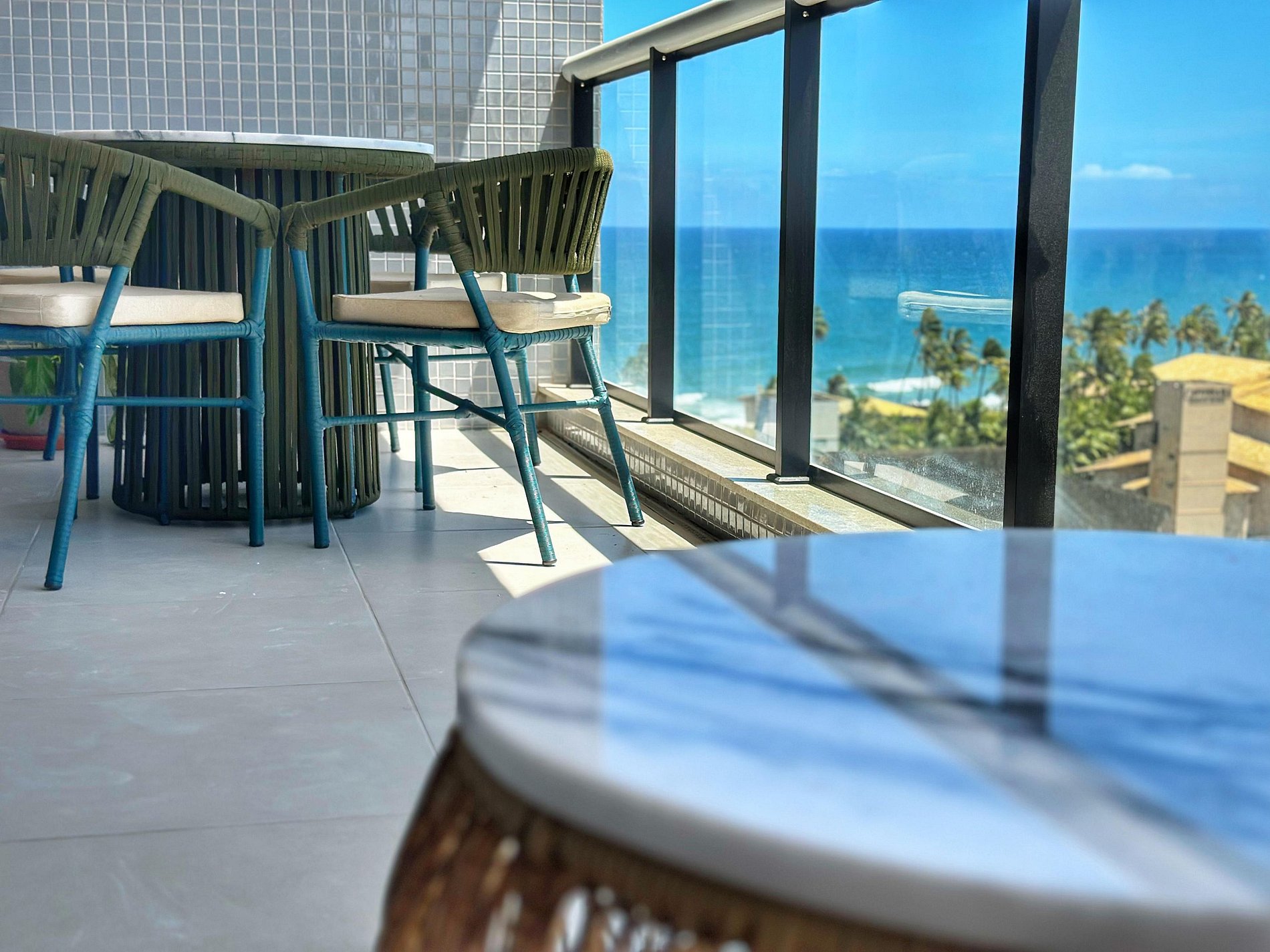 *Ampla varanda com mesa cadeiras e um sofá além de uma vista deslumbrante do mar ou pôr do sol de Salvador.