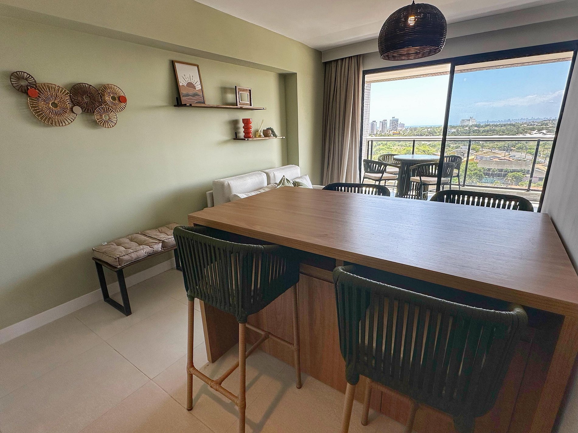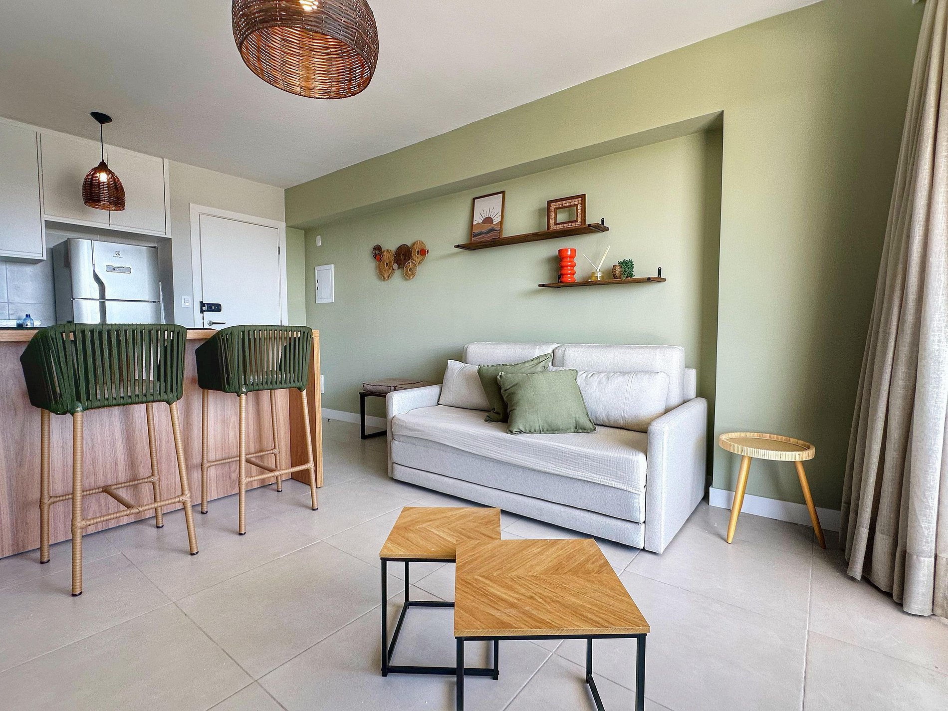 *Sala- Smart TV c/ Netflix e Canais abertos + sofá-cama de casal na sala ((com ar condicionado)) e bancada para refeição ou trabalho.