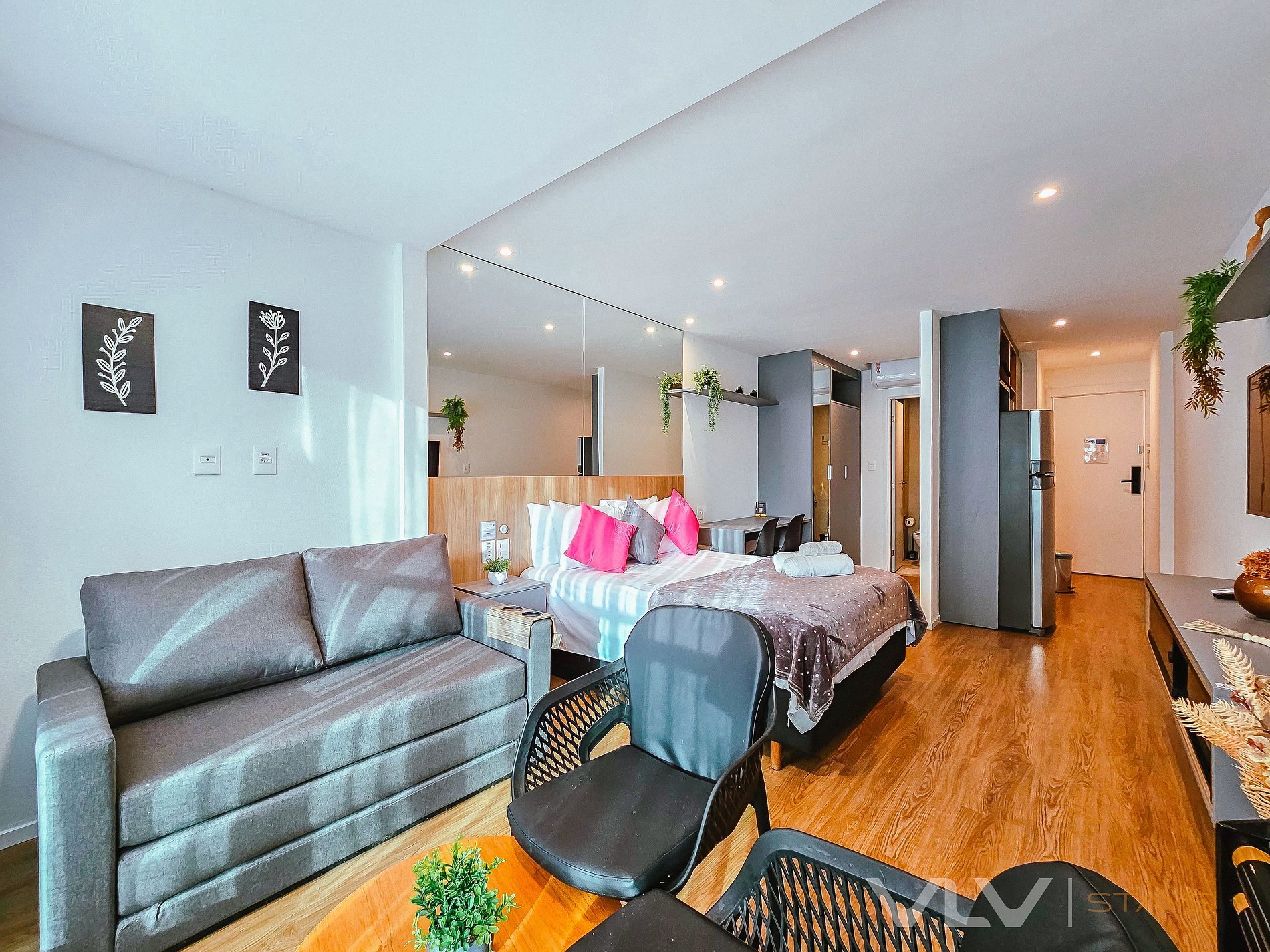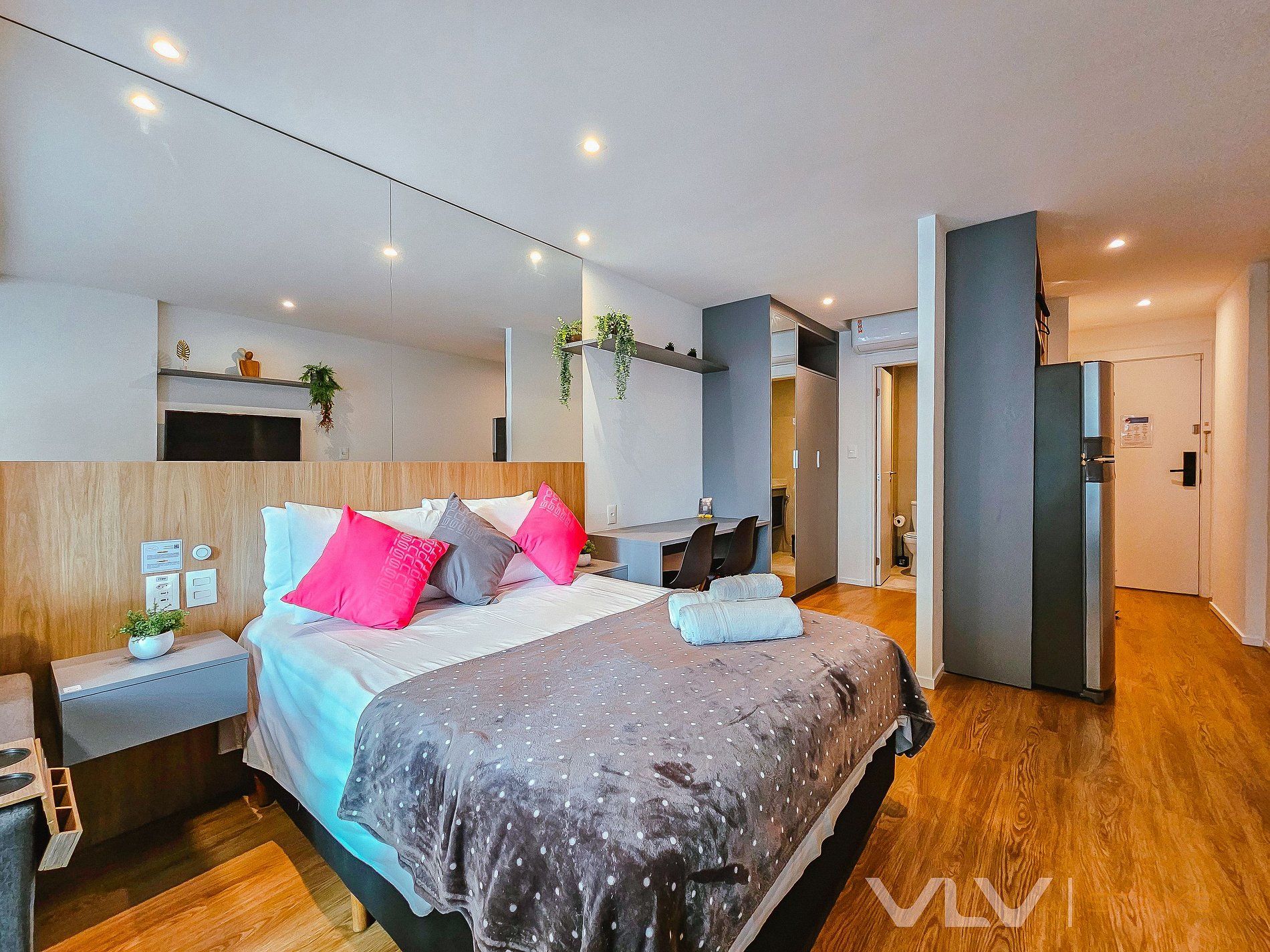 Conforto total: Studios modernos e bem equipados, com cozinha completa, ar-condicionado, e Wi-Fi de alta velocidade, para que você tenha toda a liberdade de se sentir em casa.