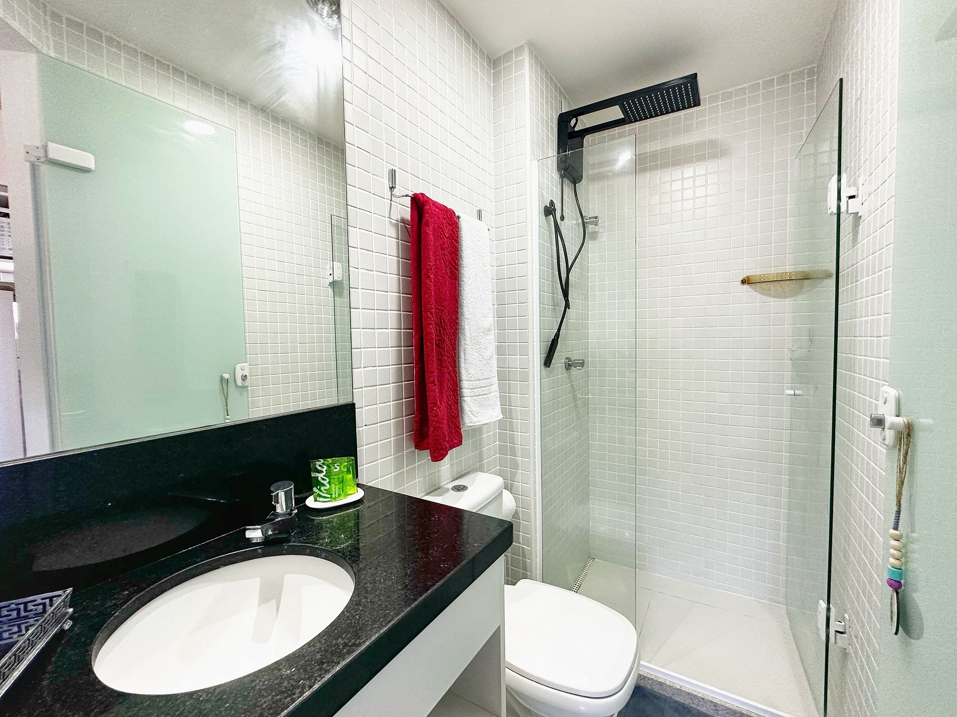 Condomínio dispõe: Portaria 24h, elevadores, cameras de segurança, academia climatizada com vista ao mar, lavanderia (paga), coworking, salão de festa, garagem coberta(rotativa mediante disponibilidade), interfone, piscina na cobertura com vista panorâmica para o mar. Hóspede com total acesso.