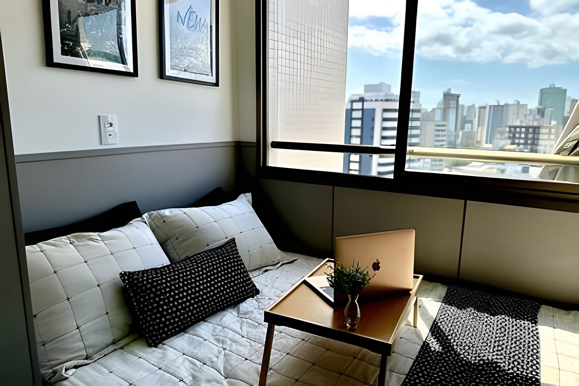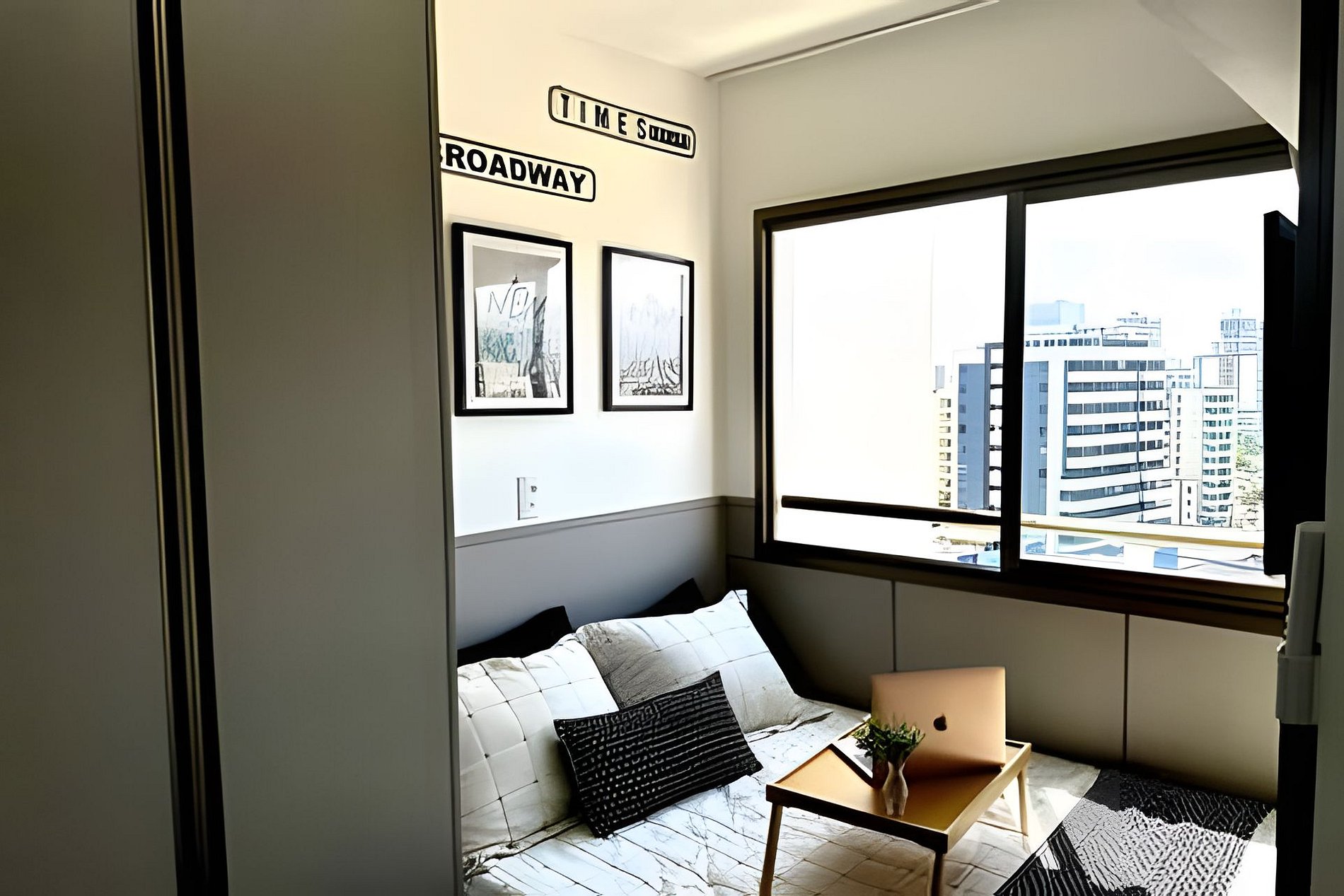 A janela do apartamento tem vista para o horizonte e o predio conta com 11° andares-- Rooftop - onde fica a piscina, academia, lavanderia, coworking.