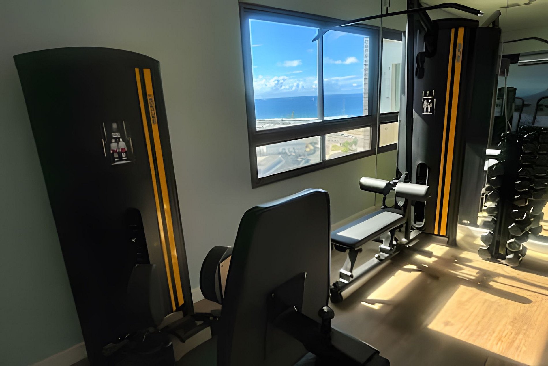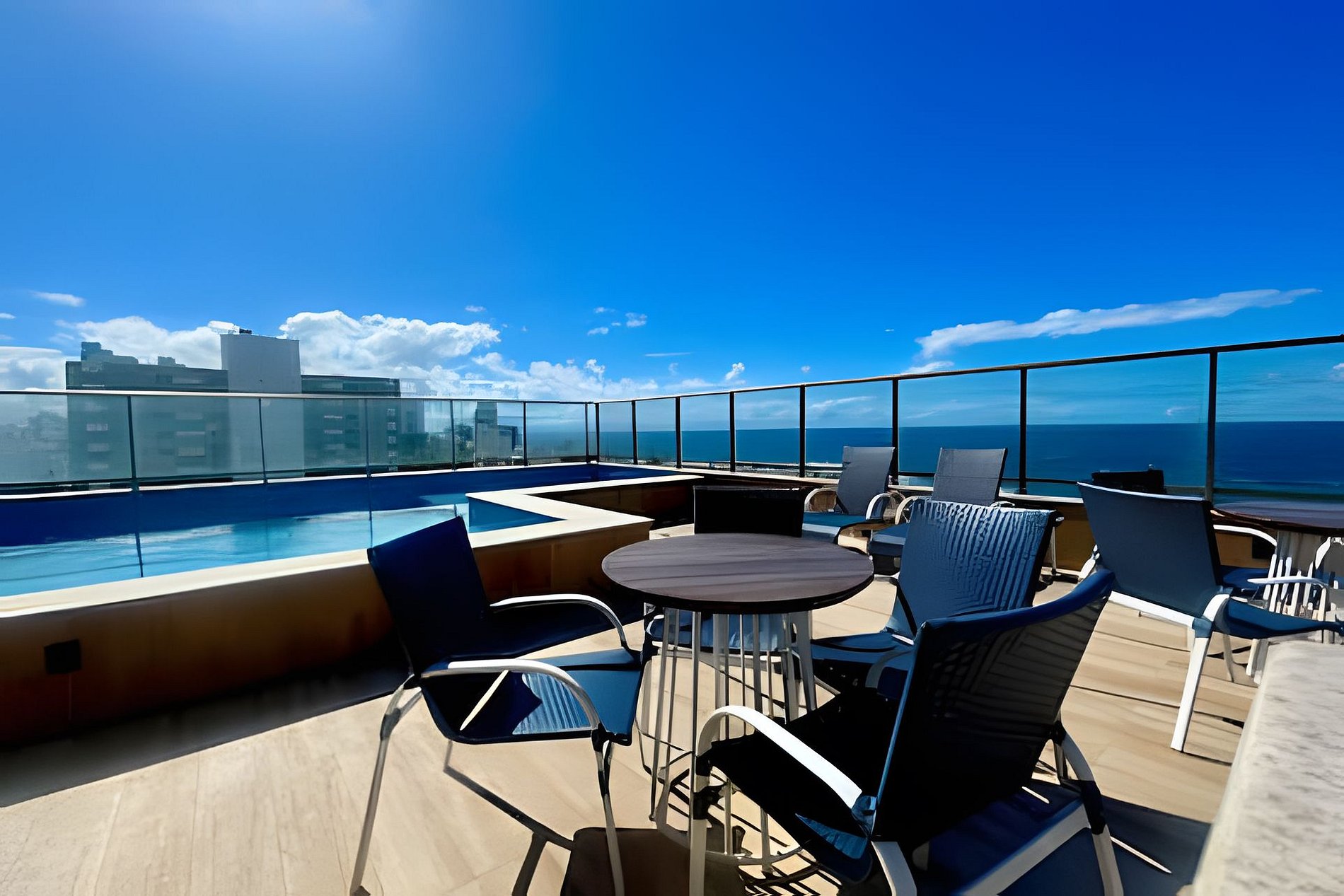 Condomínio dispõe: Portaria 24h, elevadores, cameras de segurança, academia climatizada com vista ao mar, lavanderia (paga), coworking, salão de festa, garagem coberta(rotativa mediante disponibilidade), interfone, piscina na cobertura com vista panorâmica para o mar. Hóspede com total acesso.