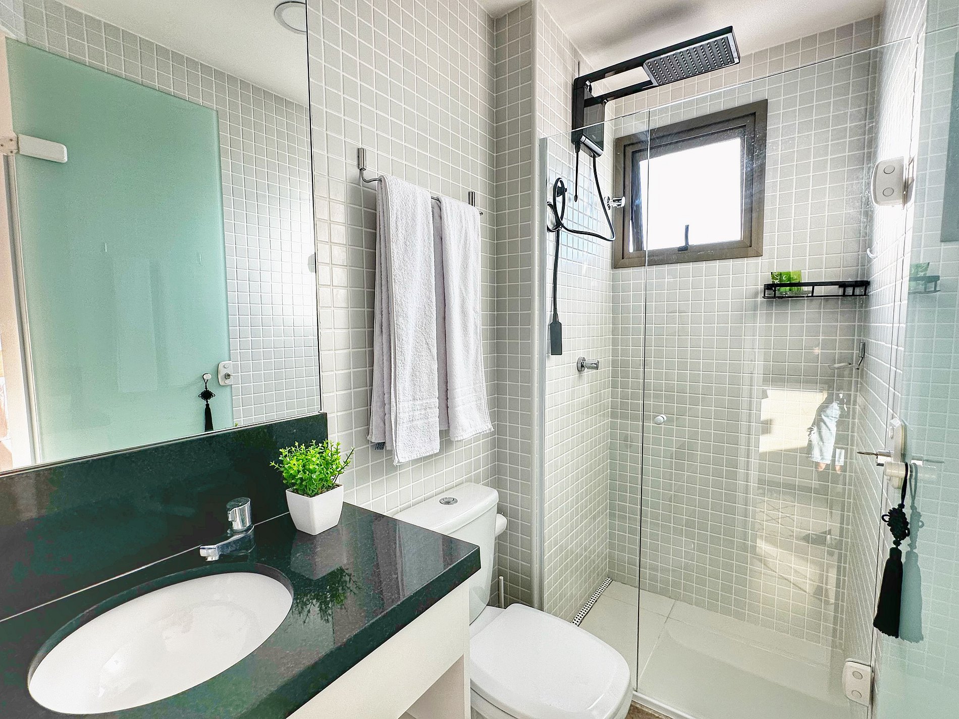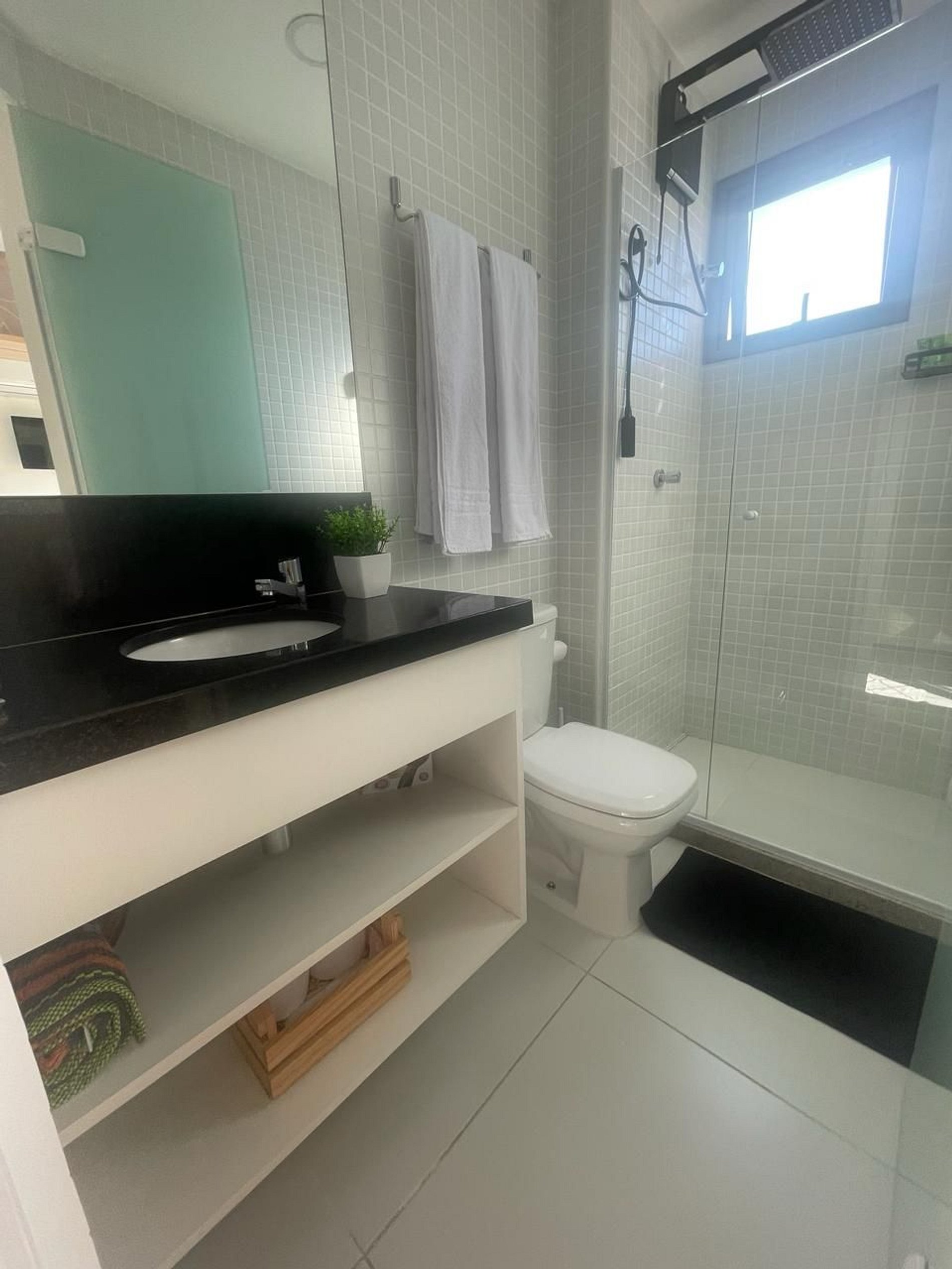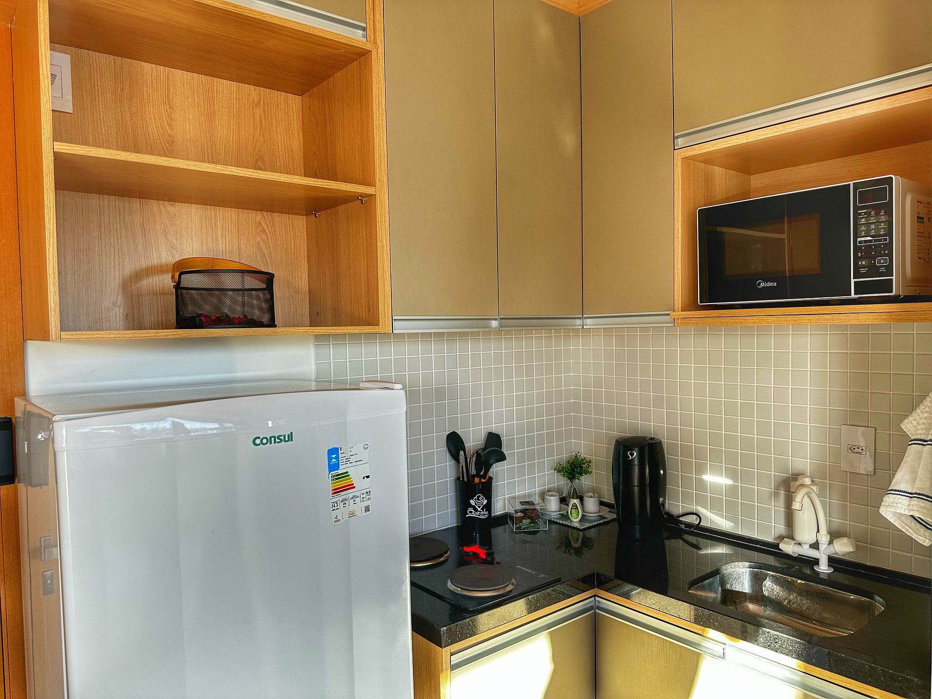 A cozinha é completa (fogão 2 bocas, geladeira, microondas, pratos, panelas, talheres, copos, taças, utensílios de cozinha, cafeteira smart) o que permite que você cozinhe com facilidade e prepare suas refeições favoritas. Além disso, o banheiro dispõe de um chuveiro com água quente, ducha higiênica e secador de cabelo.