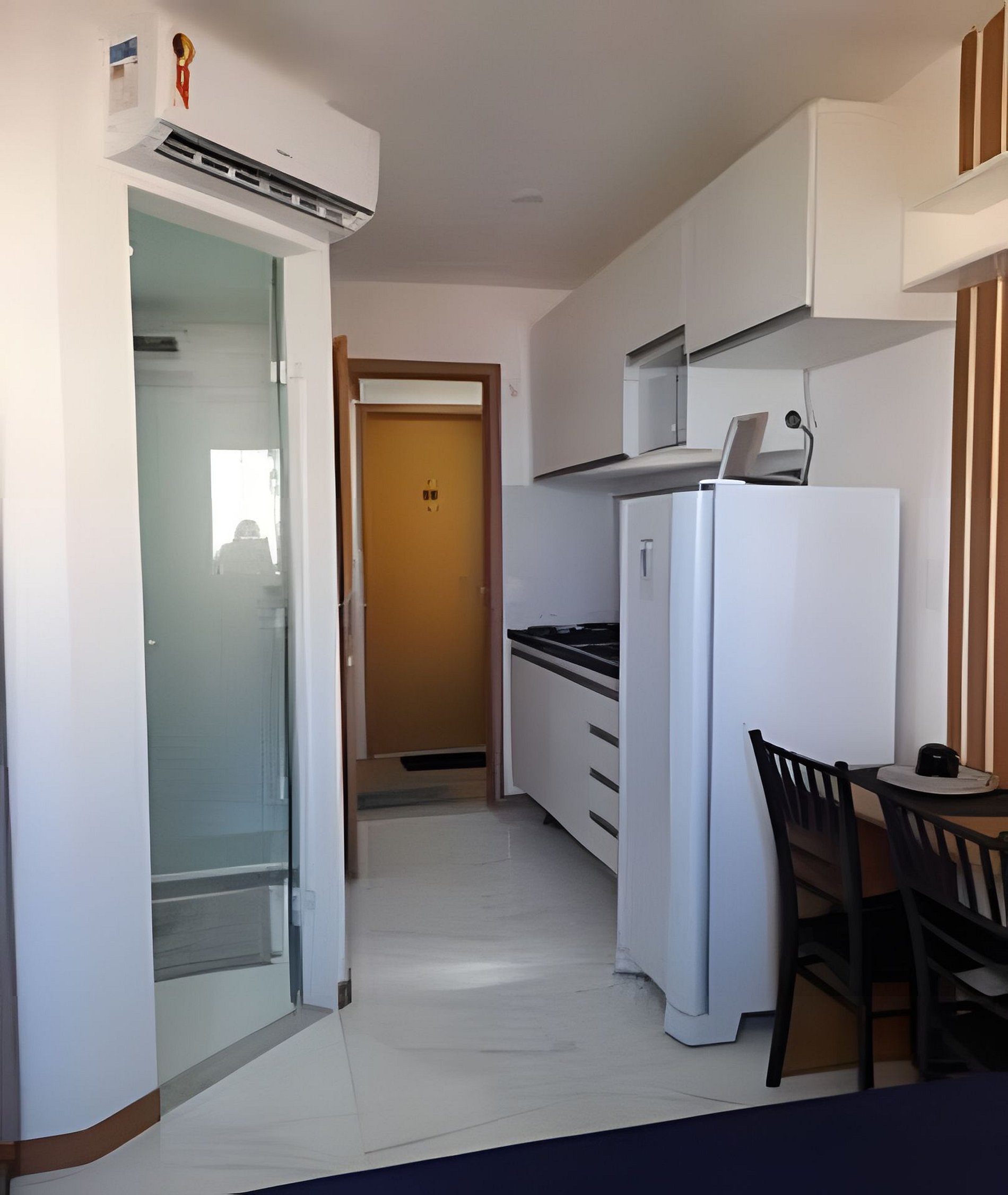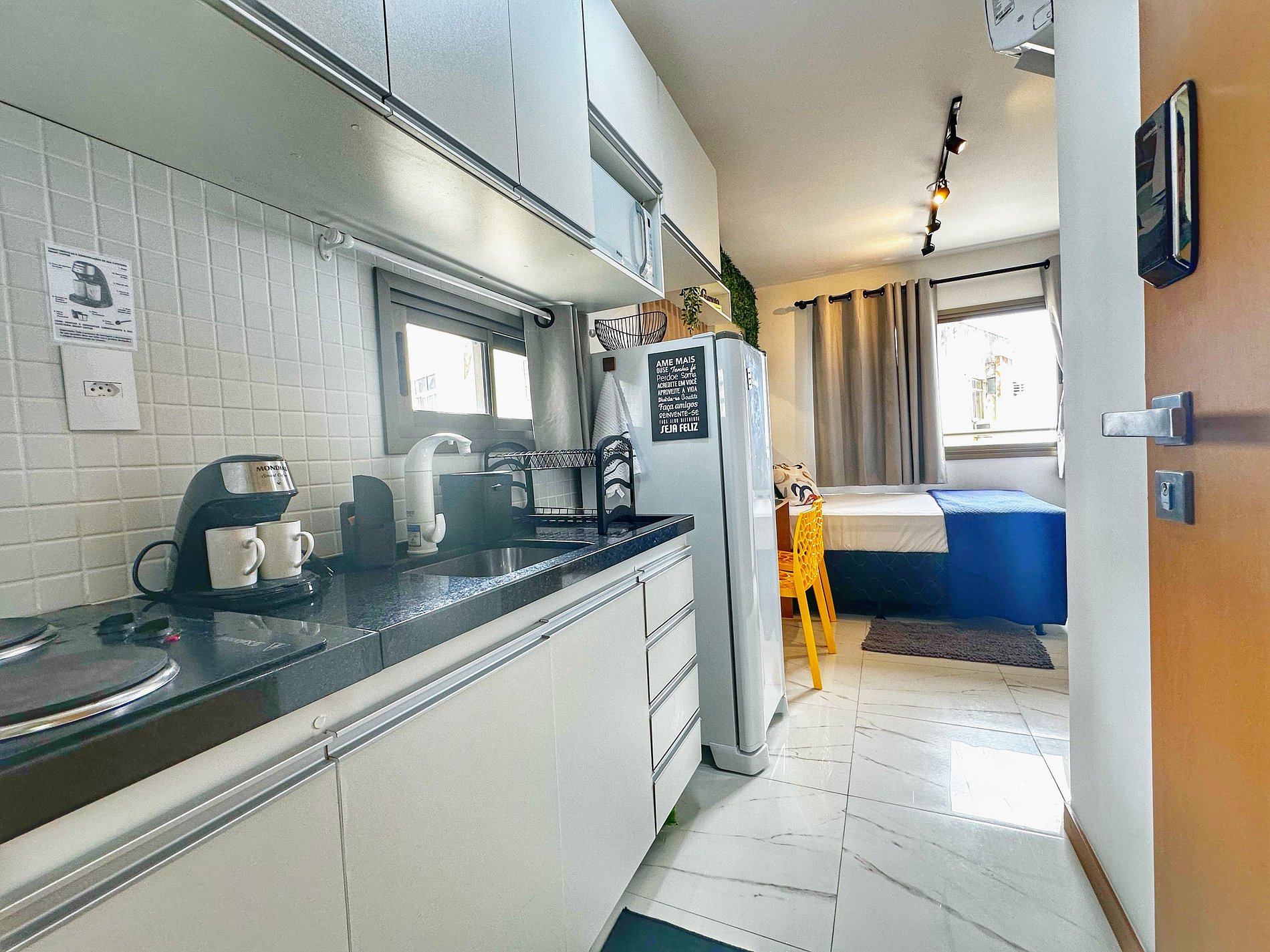 Este estúdio, oferece um ambiente interno elegante e funcional, sendo que a janela do apartamento tem vista do mar.