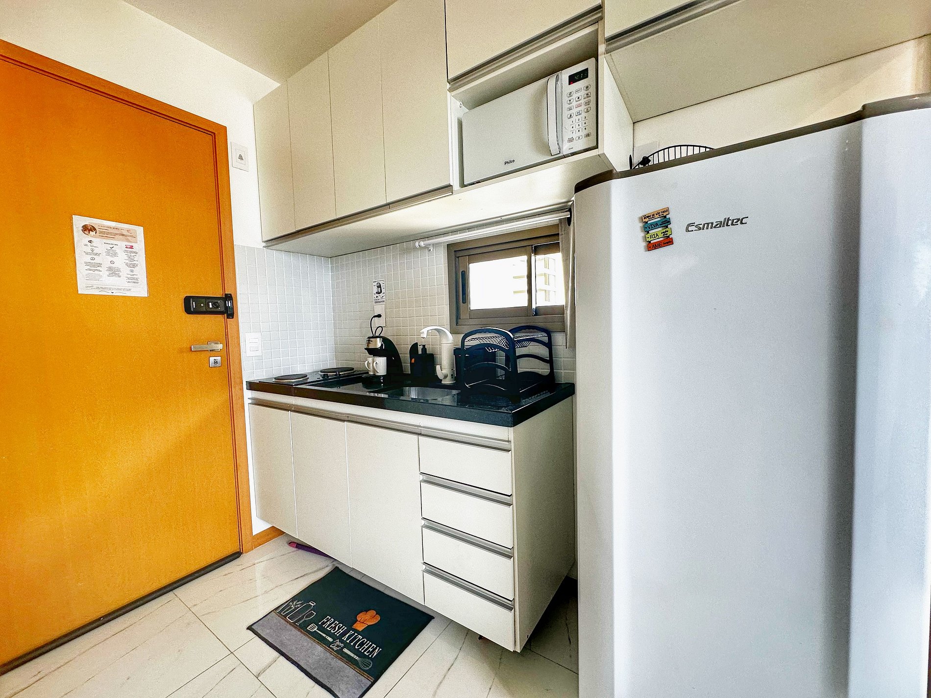 A cozinha é completa (fogão 2 bocas, geladeira, microondas, pratos, panelas, talheres, copos, taças, utensilios de cozinha, cafeteria smart) e permite que você cozinhe com facilidade e prepare suas refeições favoritas.