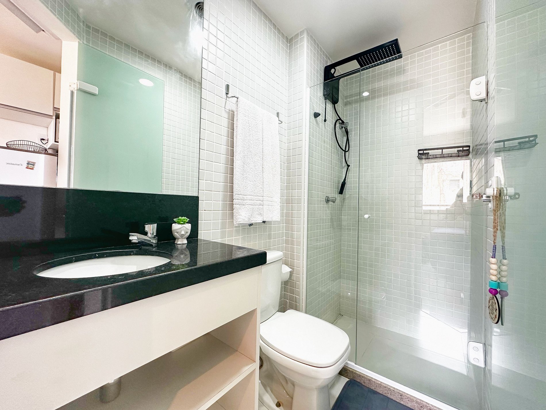 Além disso, o banheiro dispõe de um chuveiro com água quente e você também encontrará uma TV smart para seu entretenimento.