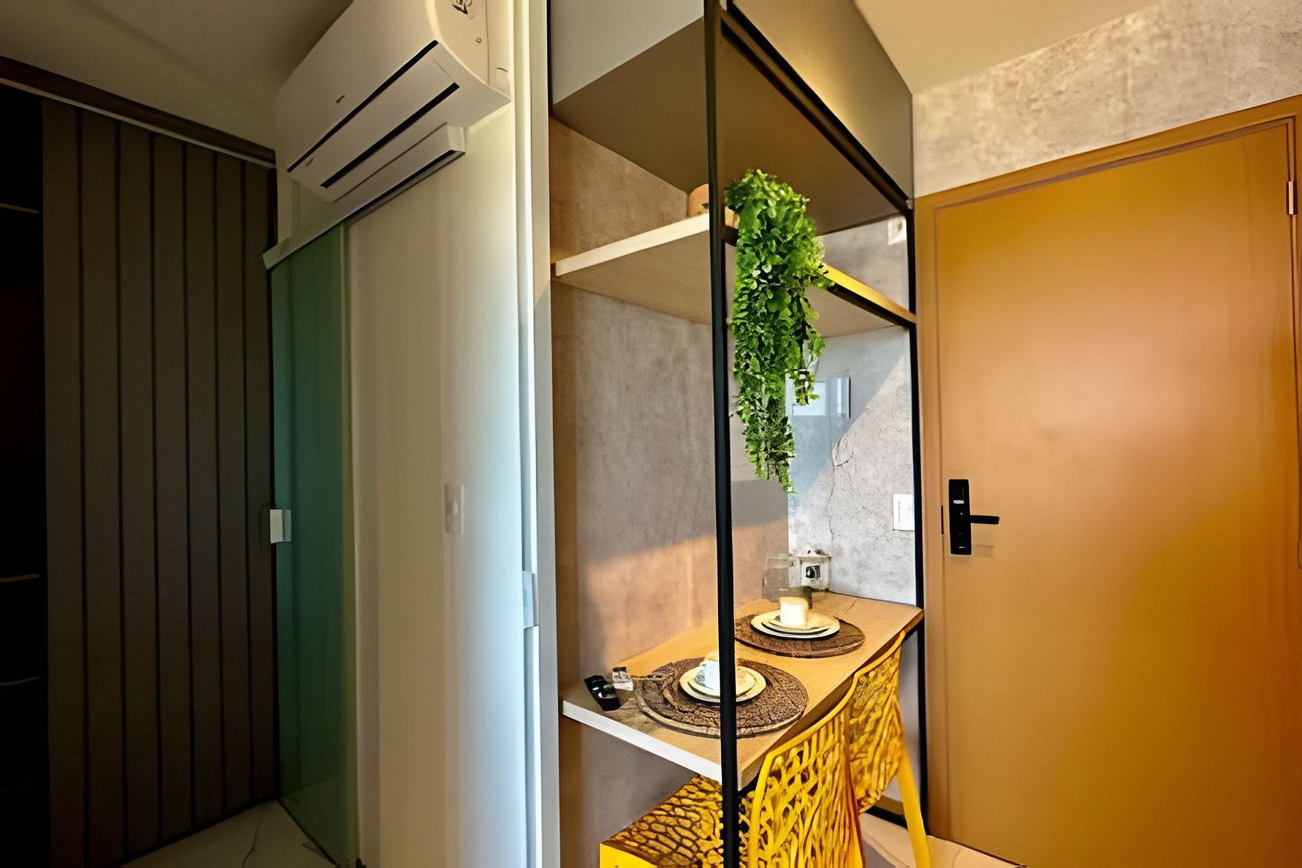 Com uma decoração charmosa, o espaço é climatizado (split) para o seu conforto. A cozinha é completa (cooktop 2 bocas, geladeira, microondas, pratos, panelas, talheres, copos, taças, utensilios de cozinha, cafeteria smart) e permite que você cozinhe com facilidade e prepare suas refeições favoritas. Além disso, o banheiro dispõe de um chuveiro com água quente e você também encontrará uma TV smart para seu entretenimento.