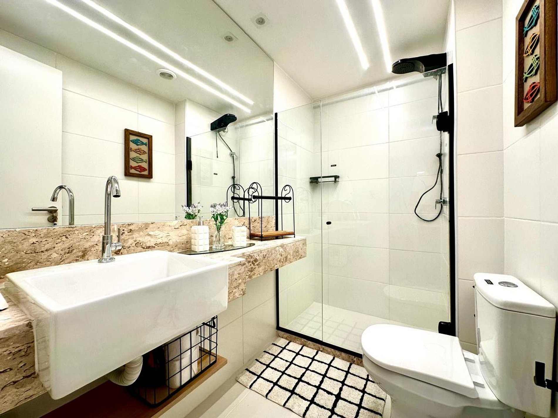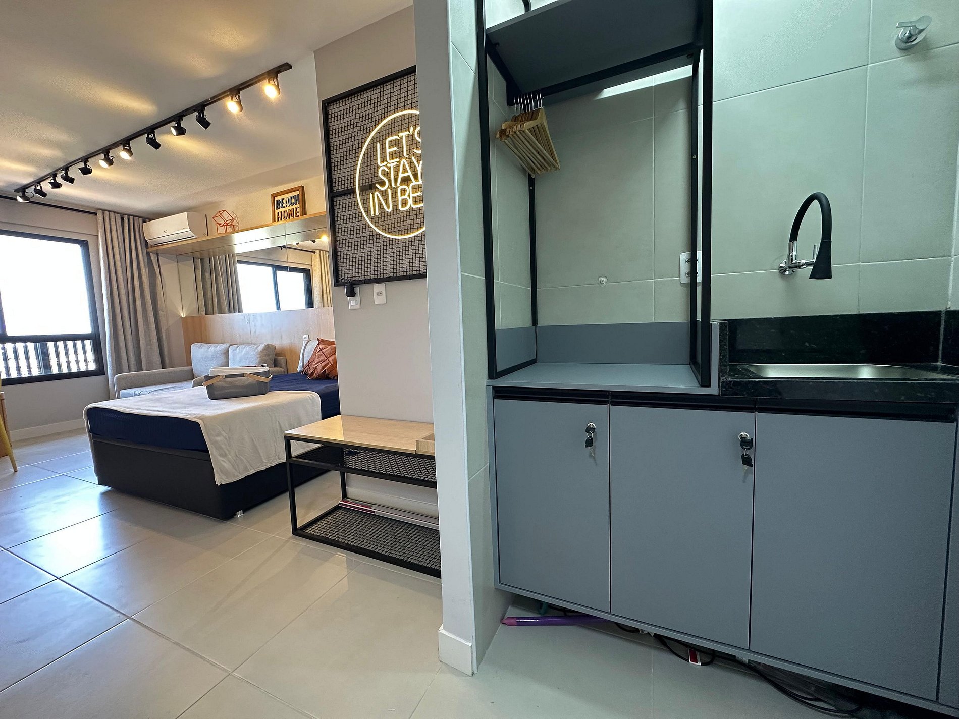 A sala e cozinha integradas, também climatizadas, possuem uma Tv smart, fogão, geladeira, microondas, utensílios de cozinha e uma pequena área de serviço. Cada detalhe aqui foi pensando para lhe dar o máximo de conforto.