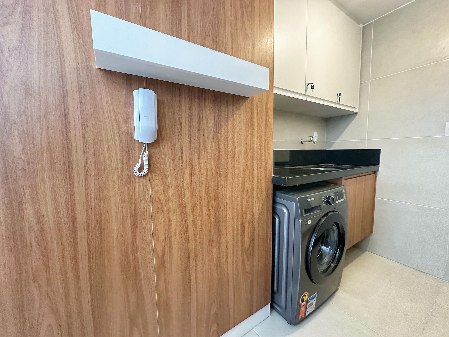 O apartamento conta com uma suíte com ar condicionado, sala, lavabo cozinha, área de serviço e uma super varanda. Apto possui ar condicionado na sala e quarto. Conta com uma Tv smart na espaçosa sala integrada a cozinha com fogão quatro bocas, geladeira, micro-ondas, cafeteira, utensílios de cozinha e uma pequena área de serviço com maquina de lavar, tanque e varal de chão.