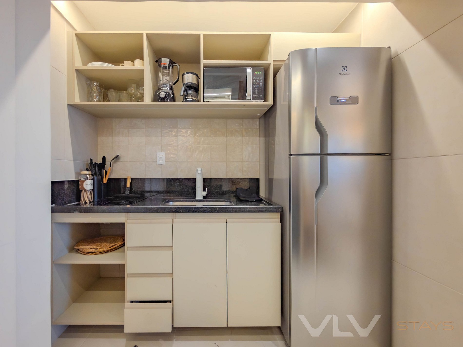 A sala e cozinha integradas, também climatizadas, possuem uma Tv smart, fogão, geladeira, microondas, utensílios de cozinha e uma pequena área de serviço. Cada detalhe aqui foi pensando para lhe dar o máximo de conforto.