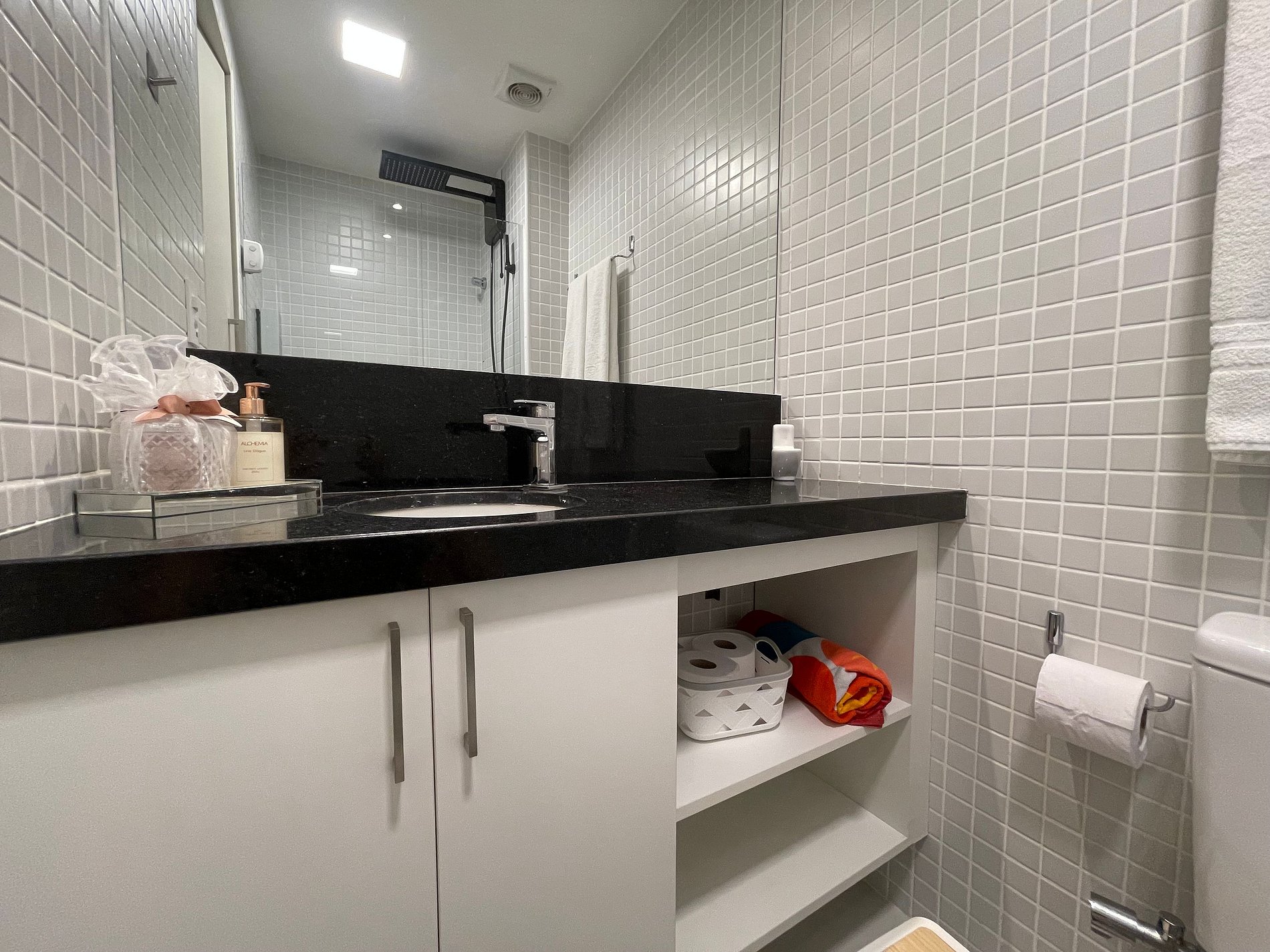 Condomínio dispõe: Portaria 24h, elevadores, cameras de segurança, academia climatizada com vista ao mar, lavanderia, coworking, salão de festa, garagem coberta(rotativa), interfone, piscina na cobertura com vista panorâmica para o mar. Hóspede com total acesso.