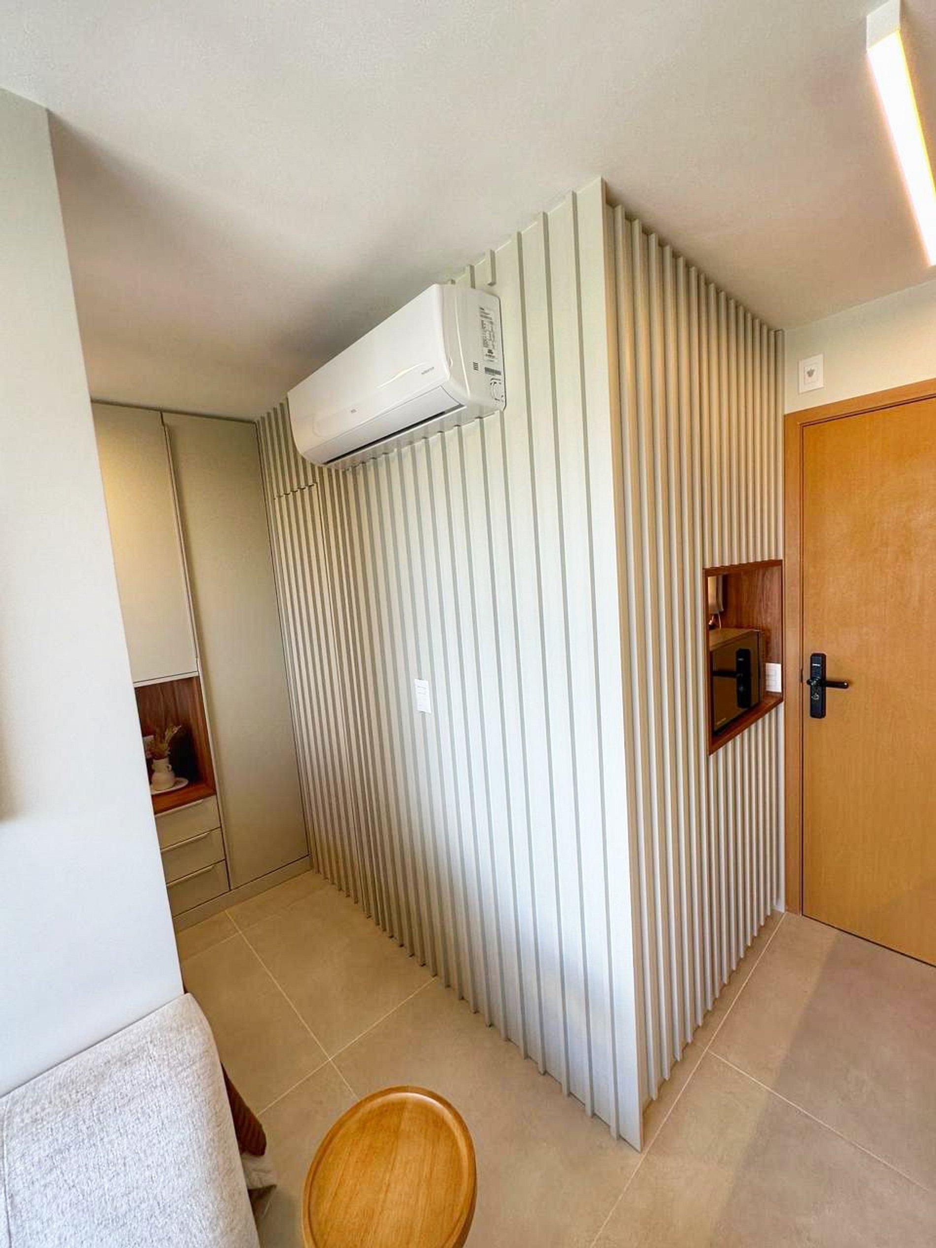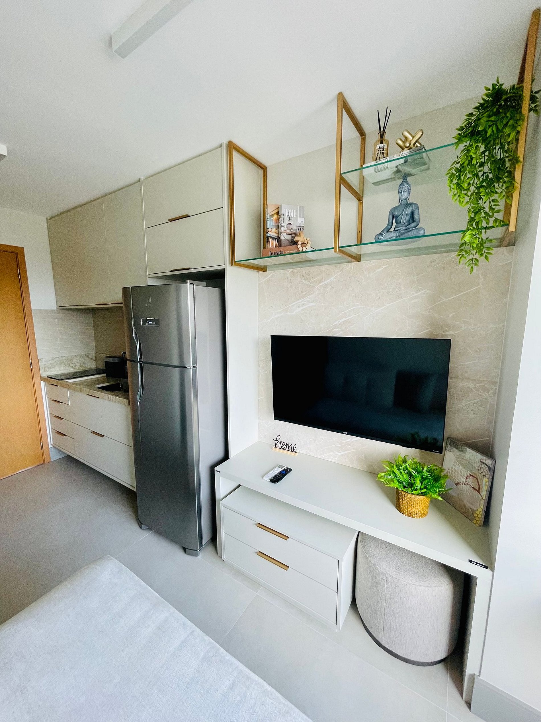 Com uma decoração charmosa, o espaço é climatizado (split) para o seu conforto. A cozinha é completa (cooktop 2 bocas, geladeira, microondas, pratos, panelas, talheres, copos, taças, utensilios de cozinha, cafeteria smart) e permite que você cozinhe com facilidade e prepare suas refeições favoritas. Além disso, o banheiro dispõe de um chuveiro com água quente e você também encontrará uma TV smart para seu entretenimento.