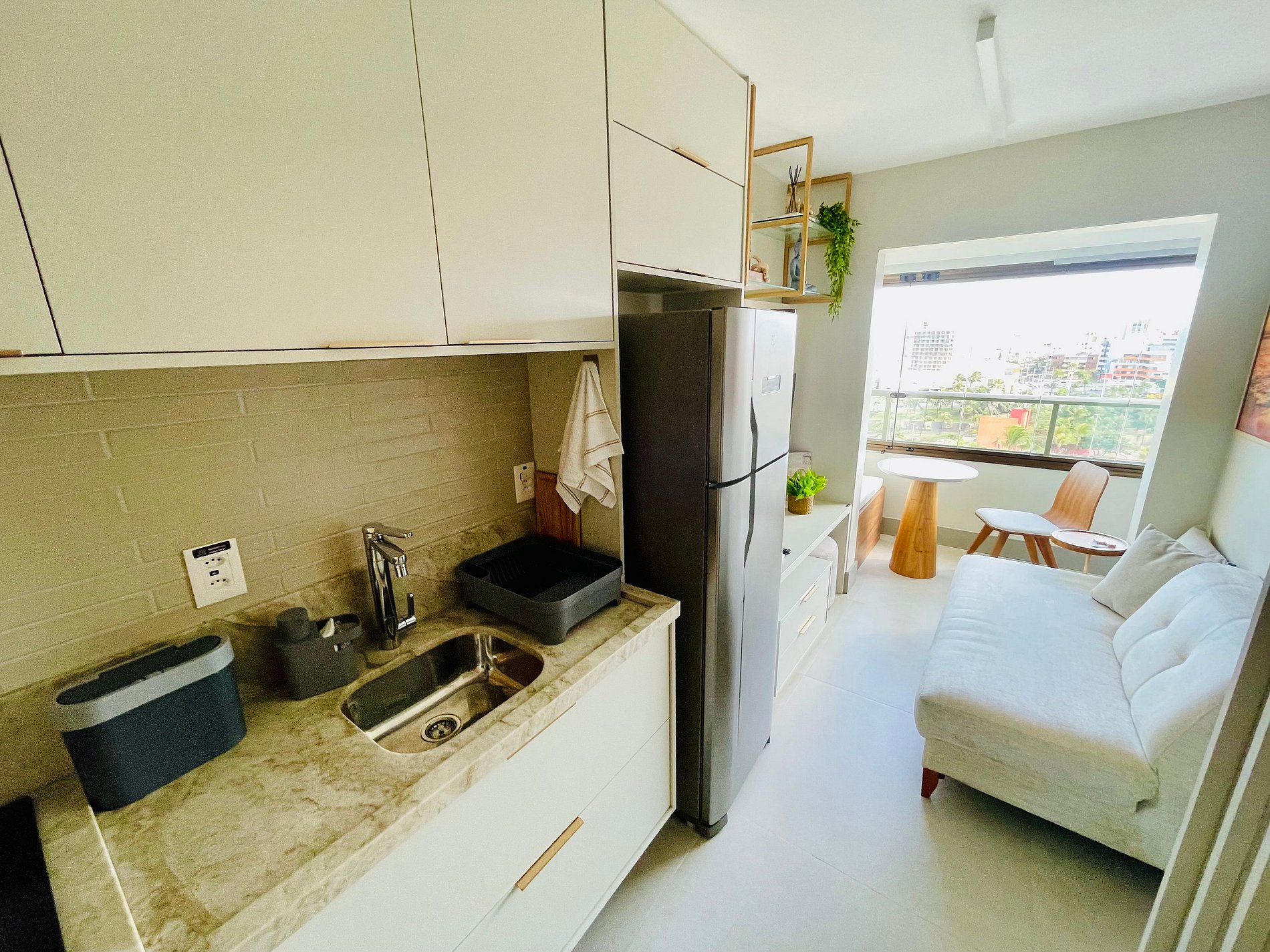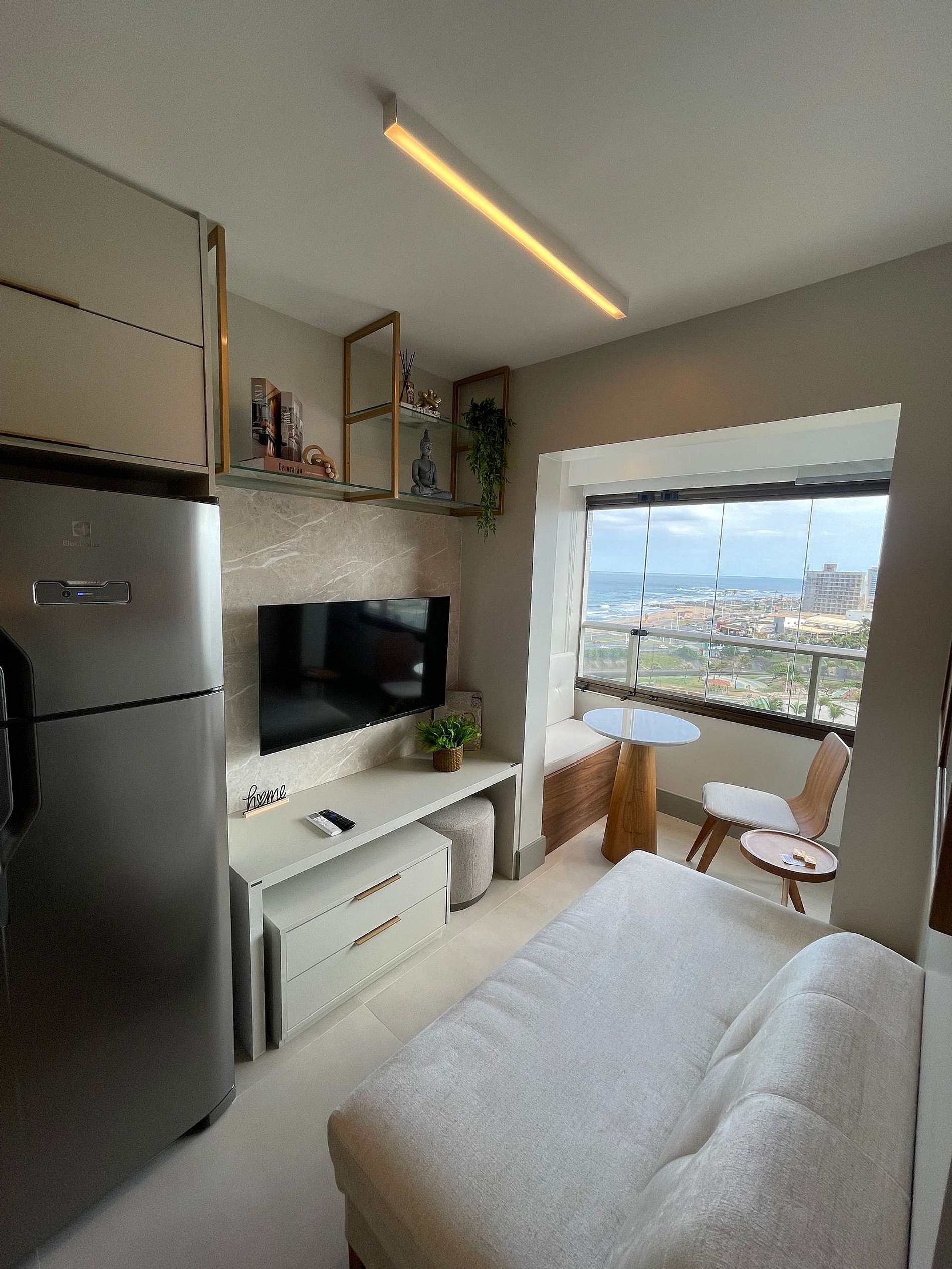 Quarto e sala cheio de estilo em excelente localização, VISTA MAR, com espaço aconchegante e moderno, perfeito para quem busca uma experiência única em Salvador. O prédio tem piscina com vista fantástica no rooftop, academia, cowork, lavanderia e estacionamento. Temos o espaço ideal! Importante: Ar condicionado no quarto e sala com ventilador. O espaco dispoe de uma casal e disponibilizamos um colchao para o terceiro hóspede como mostra a foto do anuncio.