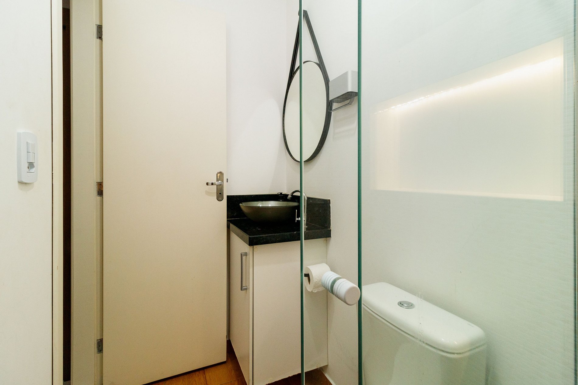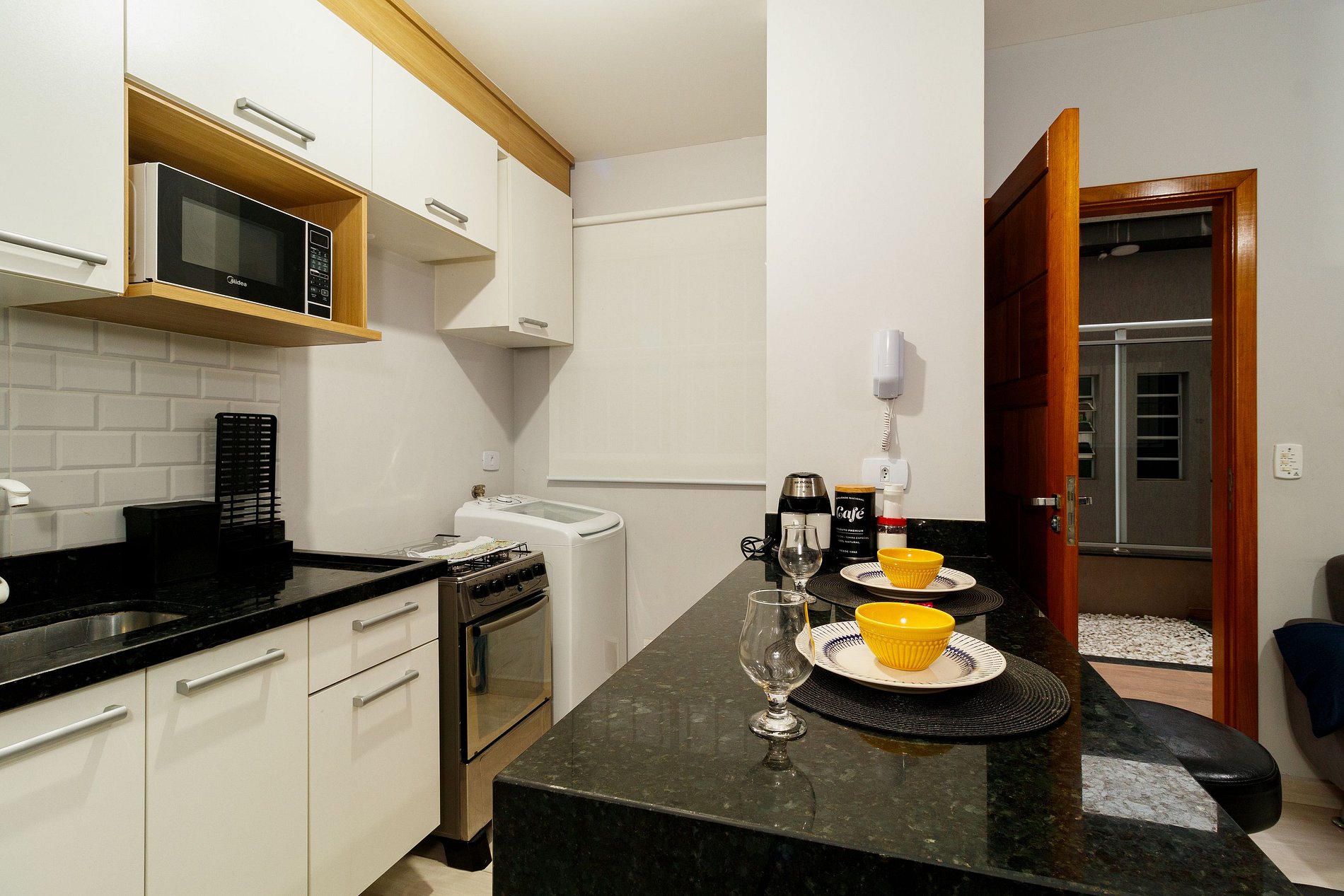 No pequeno espaço há tudo o que você precisa tal como sala com Smart TV, sofá, cama de casal, guarda-roupa banheiro com box blindex, cozinha com armários e utensílios, fogão, geladeira, microondas , maquina de lavar e lavanderia.