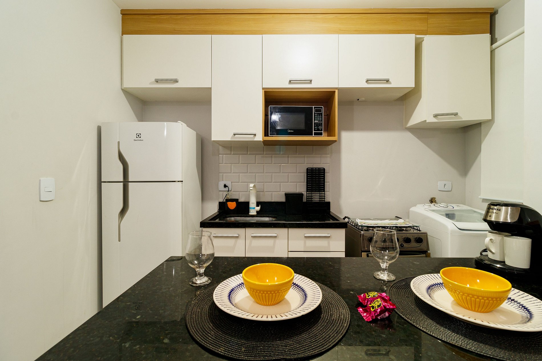 No pequeno espaço há tudo o que você precisa tal como sala com Smart TV, sofá, cama de casal, guarda-roupa banheiro com box blindex, cozinha com armários e utensílios, fogão, geladeira, microondas , maquina de lavar e lavanderia.