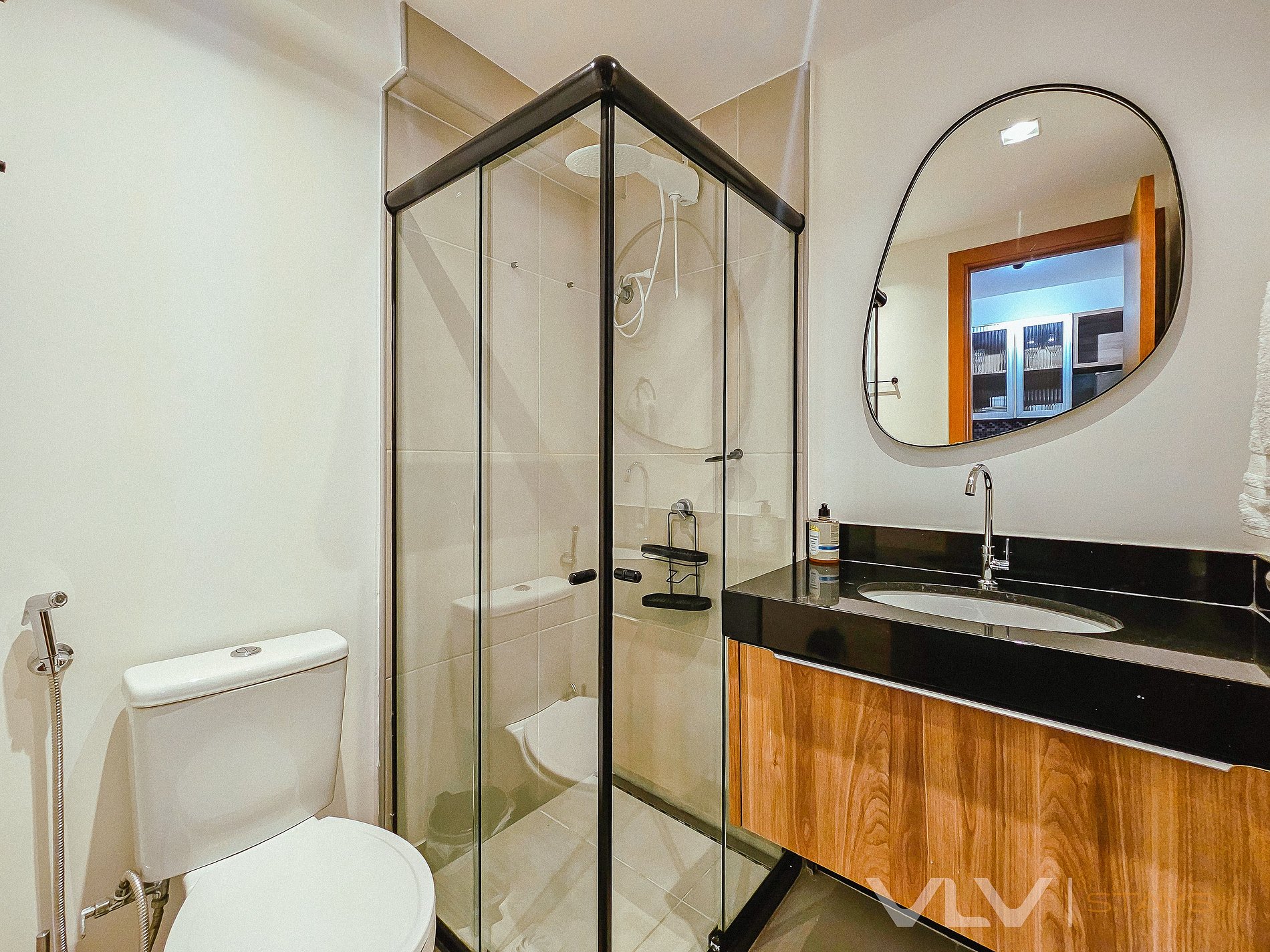 O banheiro é moderno e funcional, com box de vidro e um espelho grande, oferecendo conforto e uma sensação de amplitude.