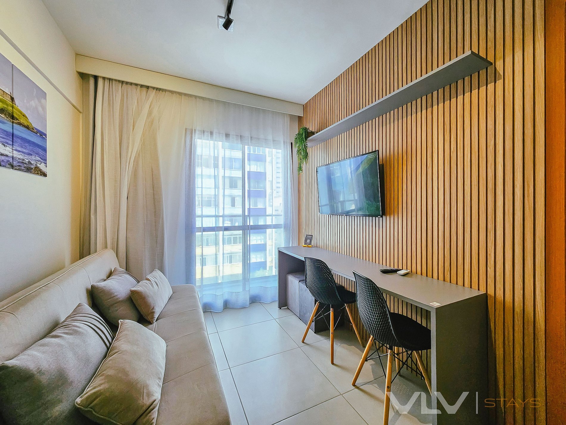 Sala dispoe de um sofa-cama, além de uma Smart TV, ar condicionado, bancada de trabalho/refeição, cadeiras e acesso a varanda.