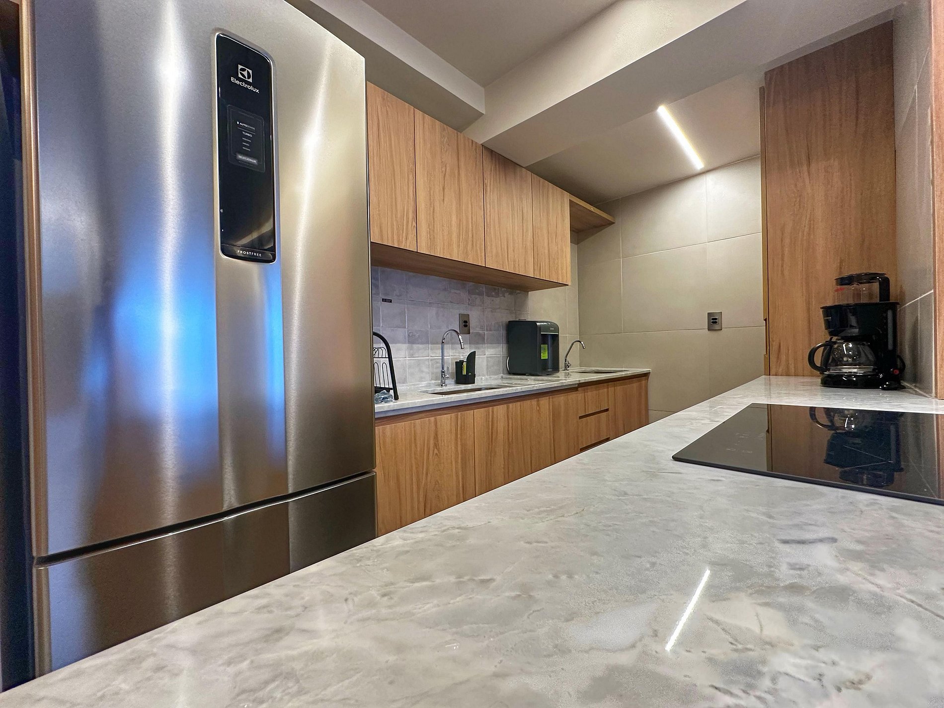 *Cozinha- equipada com itens básicos (xicaras, panelas, copos, talheres, tacas, pratos e talheres), bem como fogao de indução de 4 bocas, forno, microondas, geladeira, filtro de água gelada, cafeteira e liquidificador.