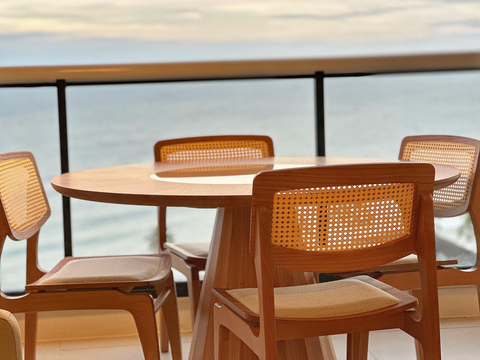 *Sala/Varanda- Smart TV, sofá-cama de casal e ar condicionado. Bancada com cozinha americana e na área da varanda ampla mesa com 4 cadeiras, 2 confortáveis cadeiras de descanso com mesa central. Cortina blackout.