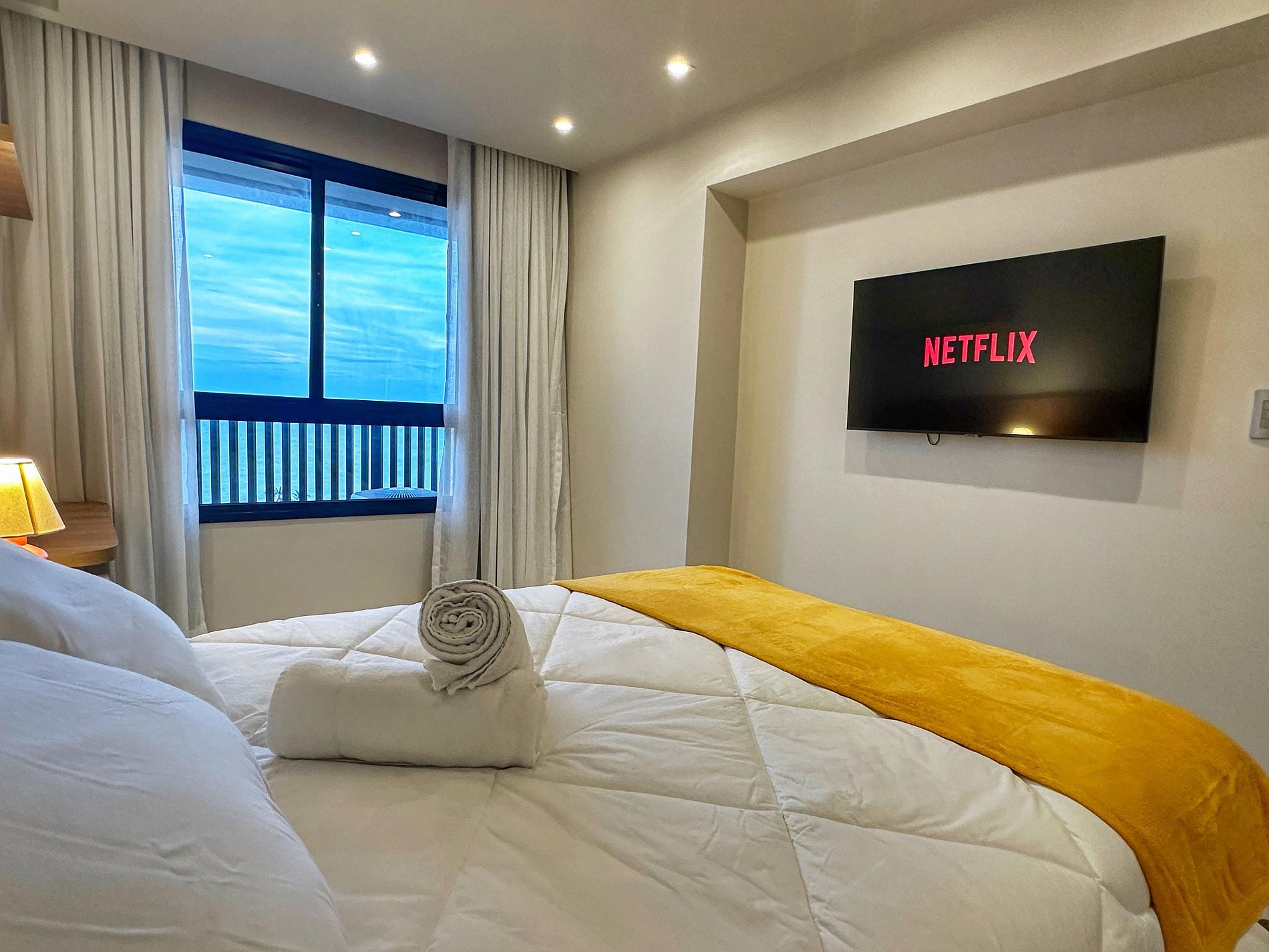 Deslumbrante apartamento finamente decorado com 2 quartos, sendo uma suíte, ar condicionado split em todos ambientes controlados individualmente, vista mar frontal. Acomoda confortavelmente 6 pessoas (2 camas de casal + 1 sofá-cama). Desfrute das comodidades do prédio, como a incrível piscina VISTA MAR no rooftop, academia completa climatizada com sala de spinning, 2 salas de coworking e brinquedoteca. Deixe-se envolver pela magia da Bahia e comece a criar memórias inesquecíveis!