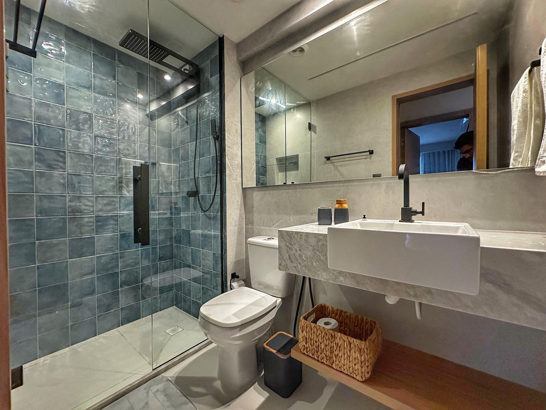 *Segundo banheiro com pia, chuveiro, vaso e espelho luminoso .