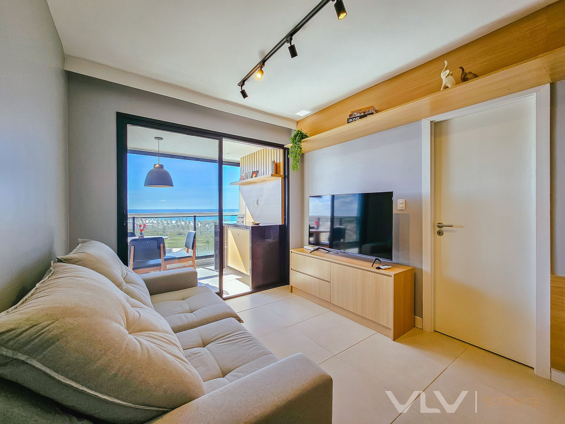 *Sala/Varanda- Smart TV, sofá e ar condicionado. Bancada com cozinha americana e na área da varanda ampla mesa com 4 cadeiras, 2 confortáveis cadeiras de descanso com mesa central. Cortina blackout.