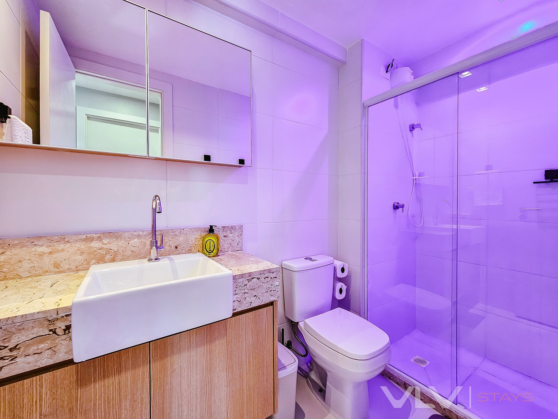 *Segundo banheiro com pia, chuveiro, vaso e espelho luminoso .