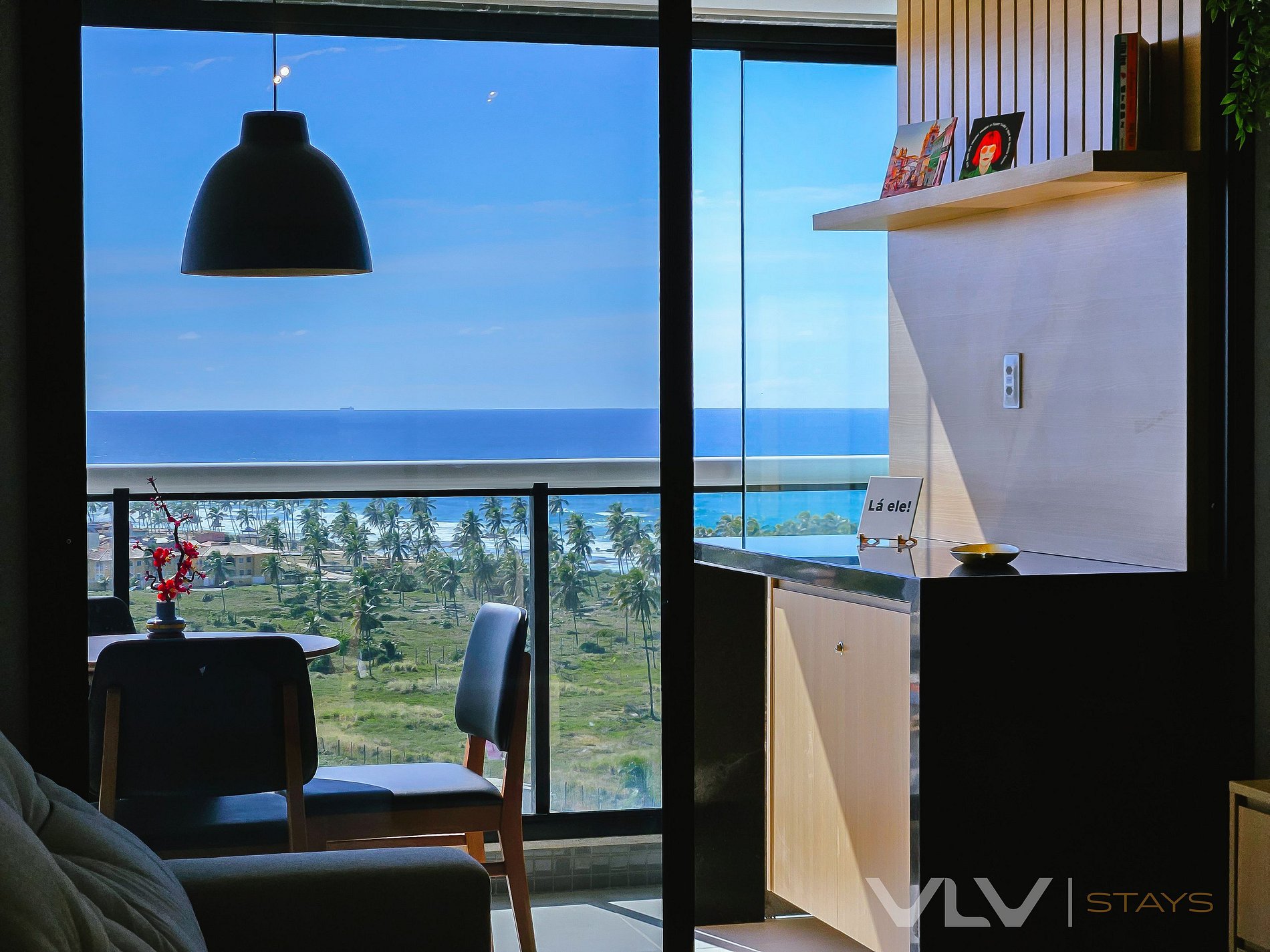 *Sala/Varanda- Smart TV, sofá e ar condicionado. Bancada com cozinha americana e na área da varanda ampla mesa com 4 cadeiras, 2 confortáveis cadeiras de descanso com mesa central. Cortina blackout.
