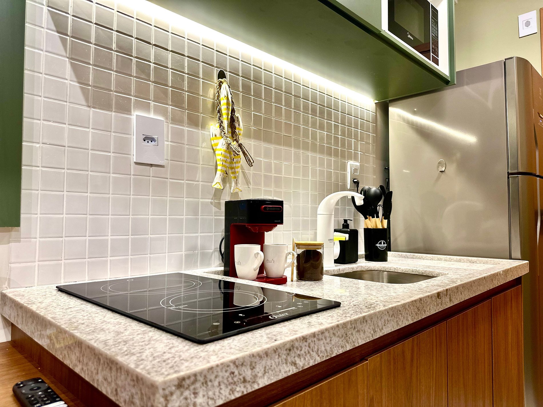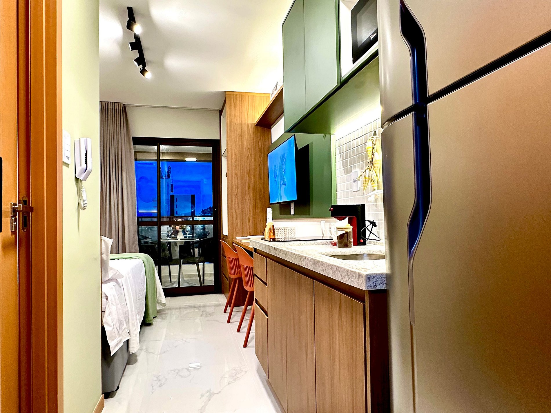 Studio com cama de casal, cozinha completa com geladeira, fogão cooktop, micro-ondas e utensílios.